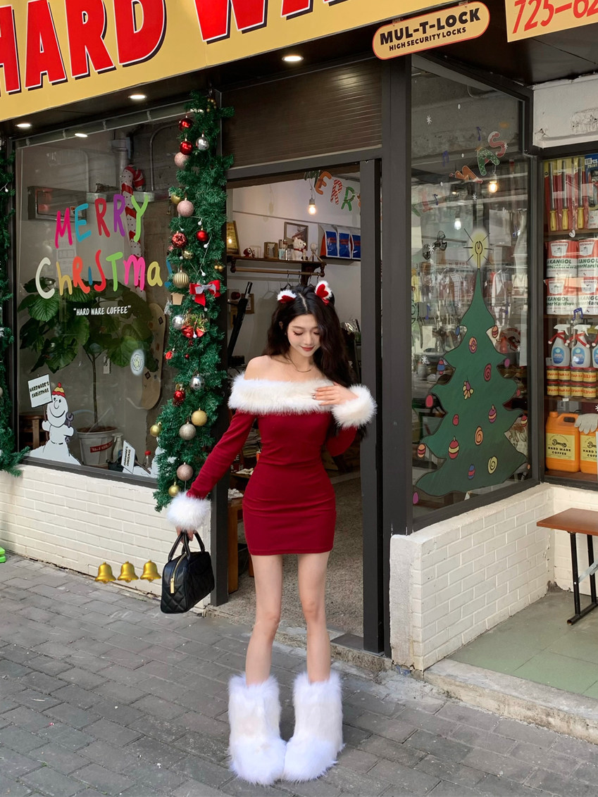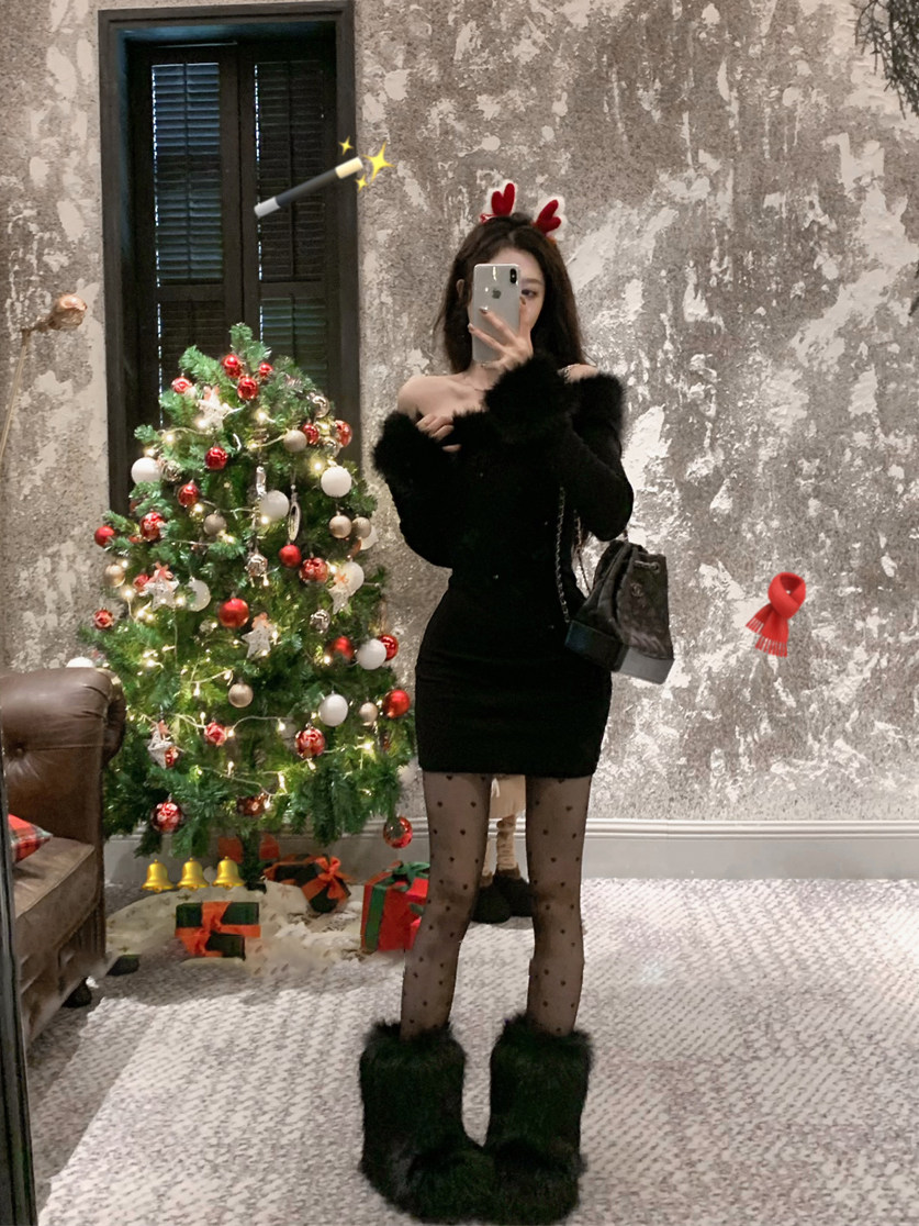 圣诞氛围感秋冬黑色辣妹毛毛领一字肩连衣裙女内搭性感显瘦包臀裙