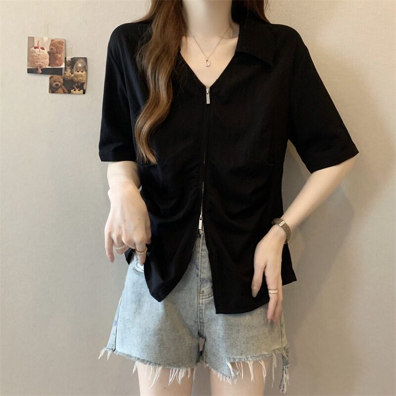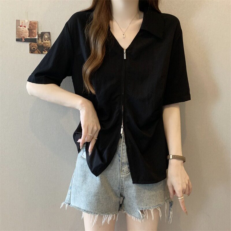 女装 韩版 V领正肩短袖 女夏季 胖mm不规则掐腰遮肚上衣 衬衫 300斤大码