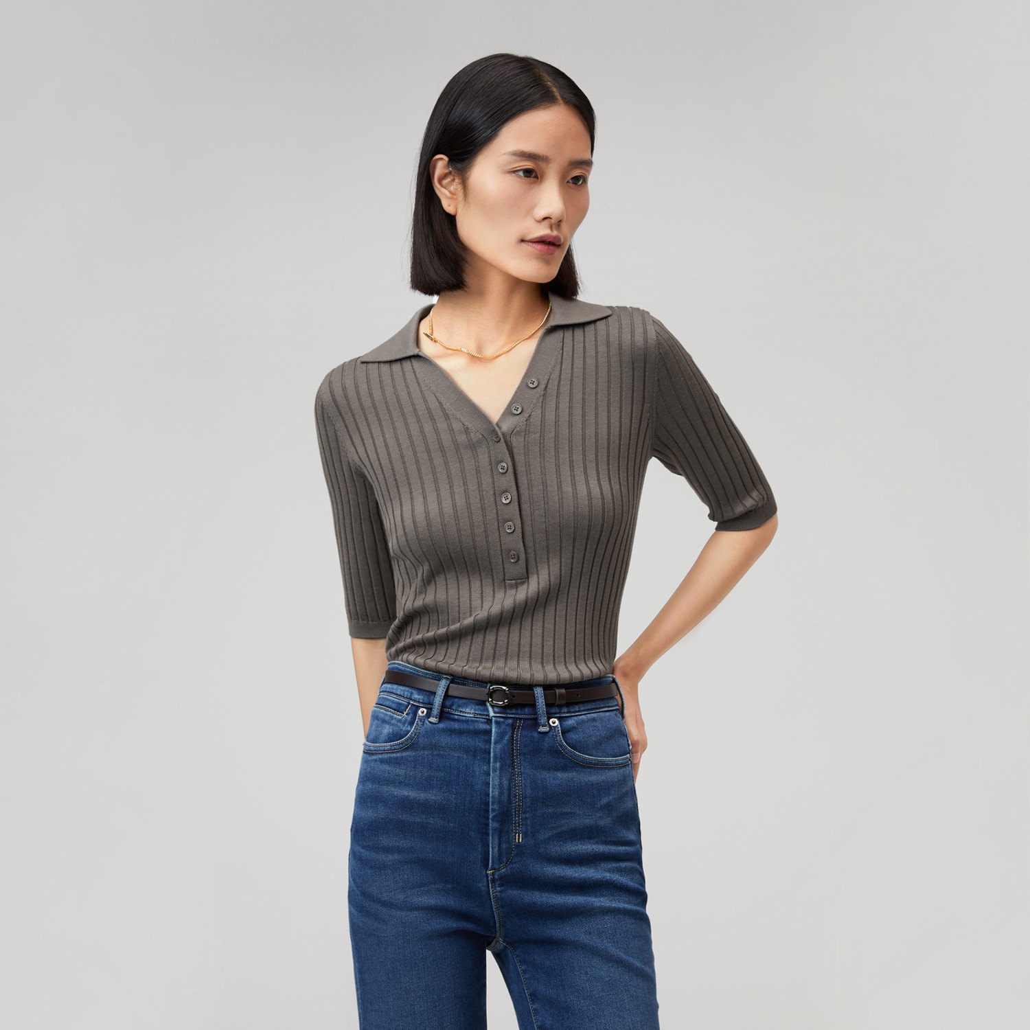 针织衫 OVV秋冬热卖 中袖 丝棉混纺POLO领罗纹修身 女装