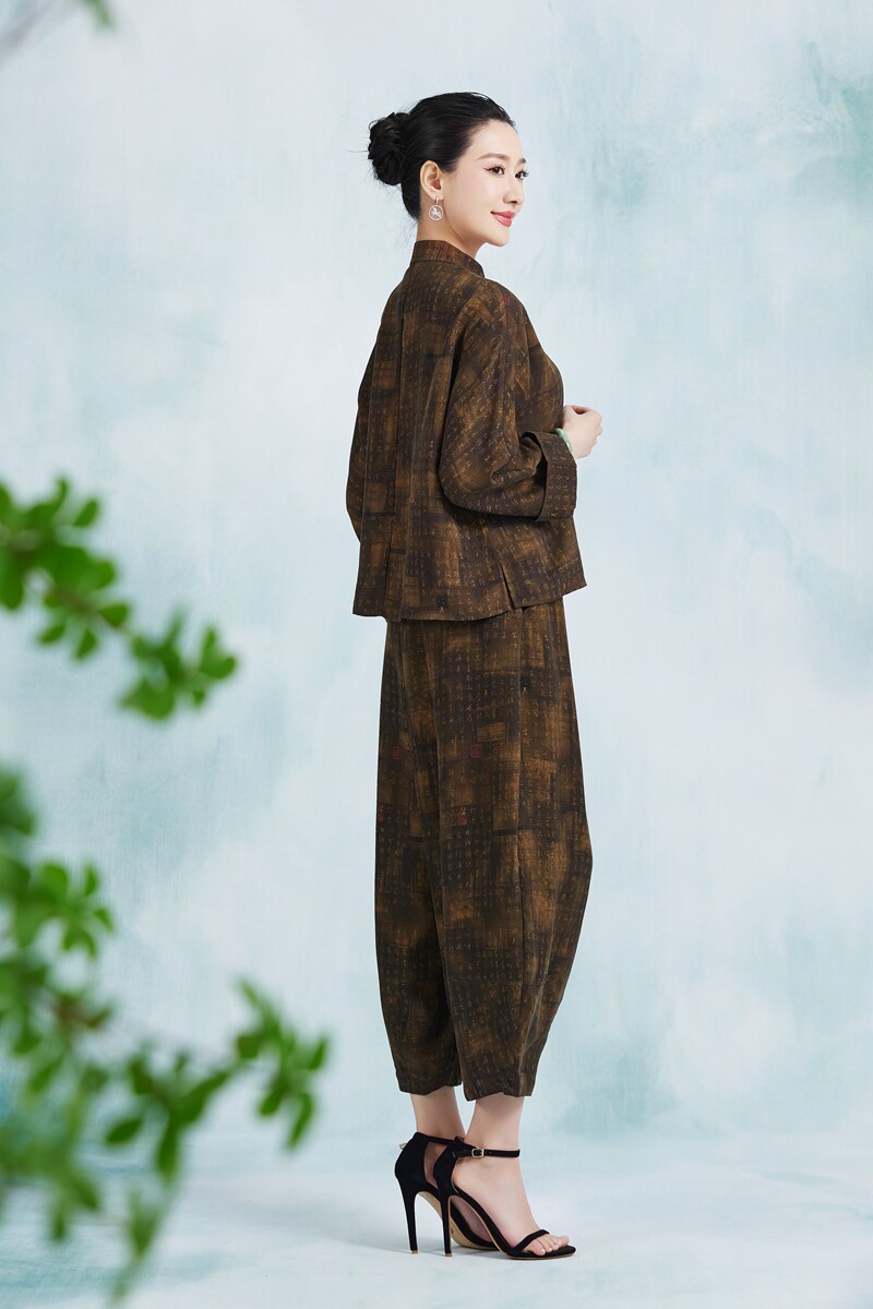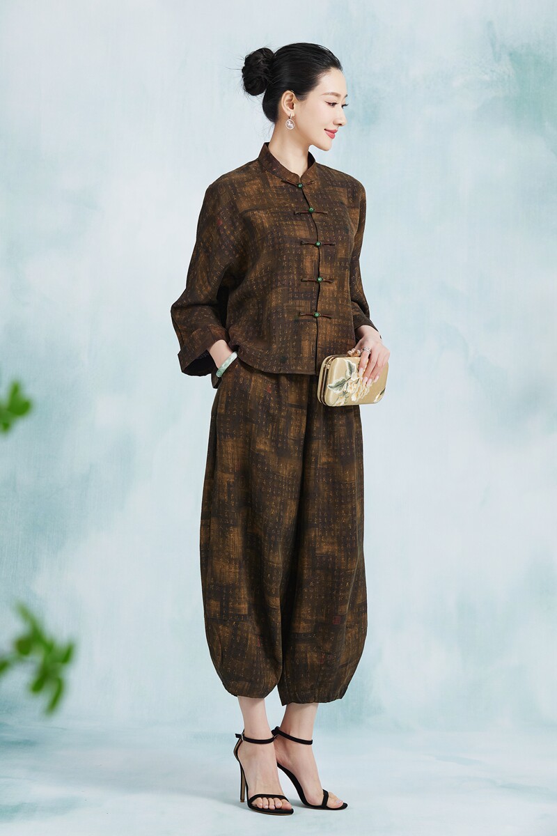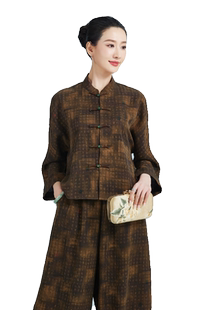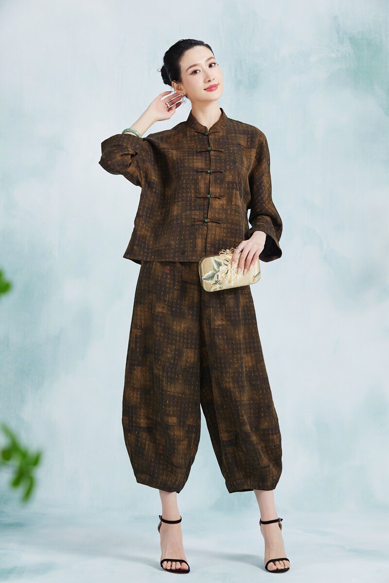100%桑蚕丝真丝香云纱花罗 四经绞罗 套装 灯笼裤 40姆 上衣 墨香