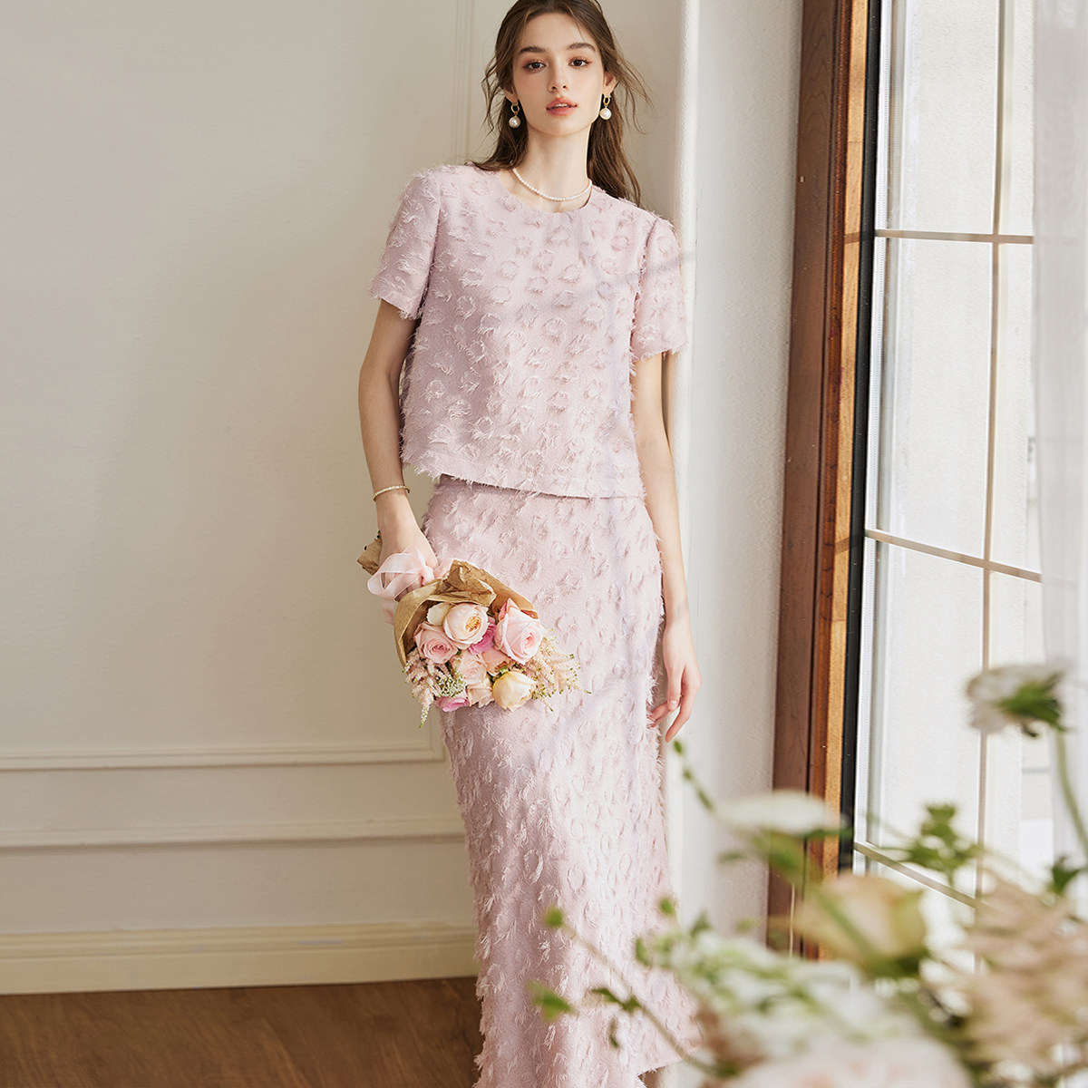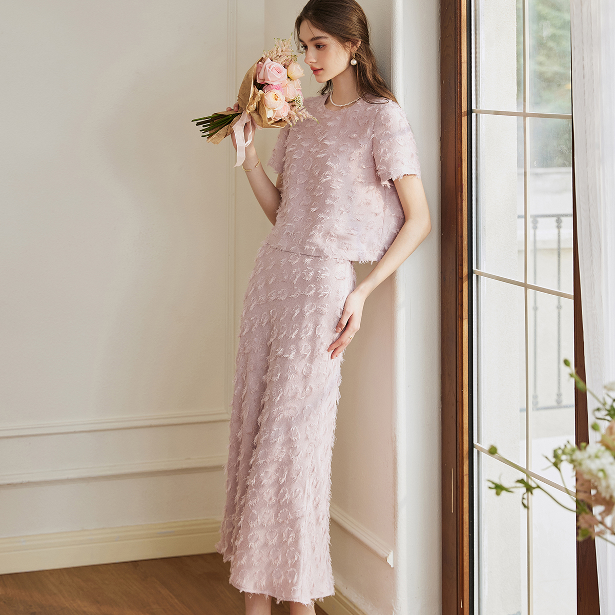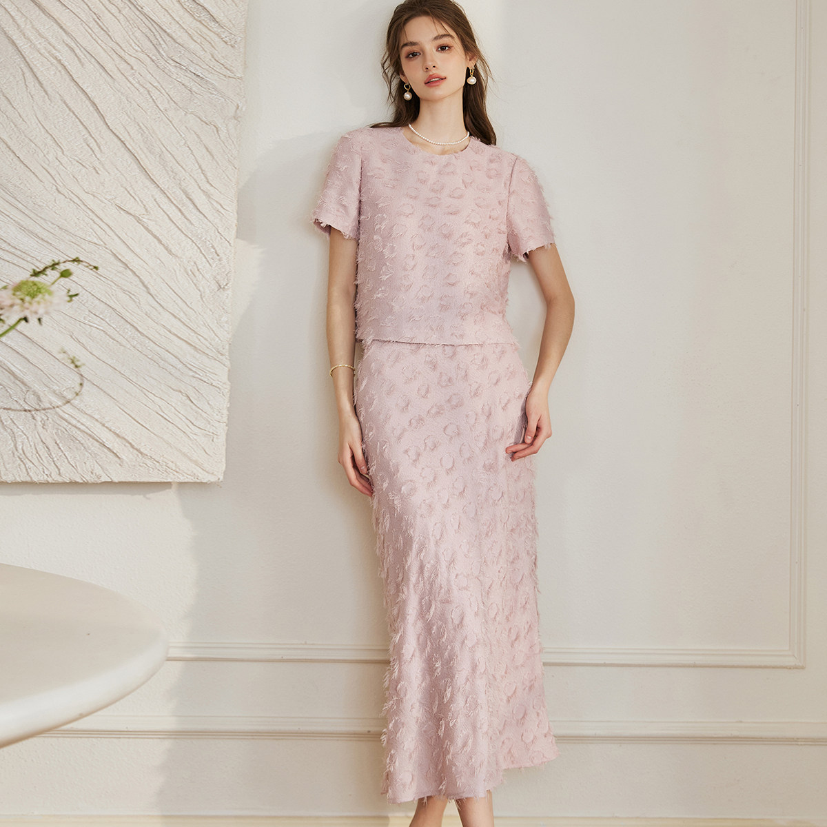 正肩T恤 女2025秋季 半身裙两件套套裙10228 套装 罗衣粉色流苏短袖