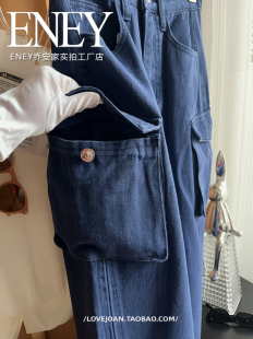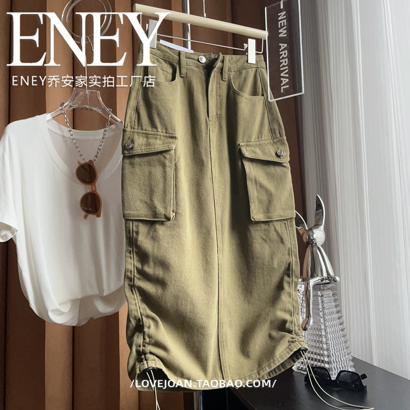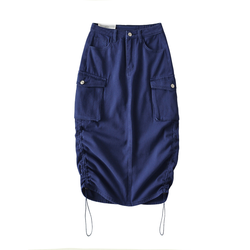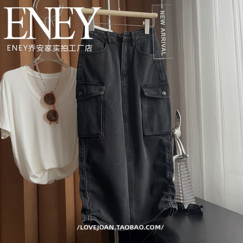 半身裙潮流美式 直筒修腿神裙 高及色调褶皱牛仔裙子高腰口袋工装