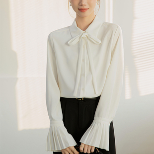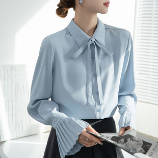 风琴袖 内搭长袖 蓝色衬衫 领带蝴蝶结职业正装 飘带上衣 法式 秋冬新款