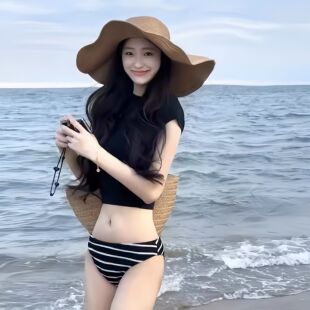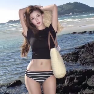 泳衣女款 小胸比基尼性感女士分体遮肉显瘦温泉 复古简约黑白条短袖
