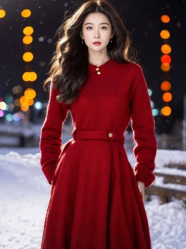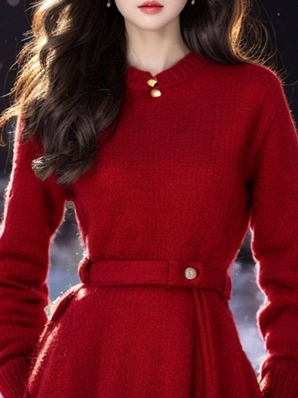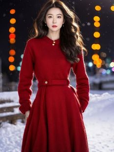 新年红色小香风针织连衣裙2024新款 毛衣裙 女秋冬高级气场强大长款