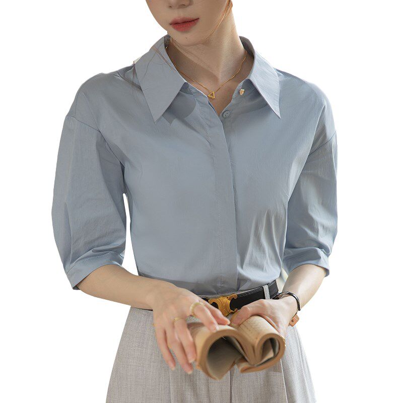 通勤商务面试ol教师职业面试灰色西装 新品 正装 女夏l短袖 蓝色衬衫
