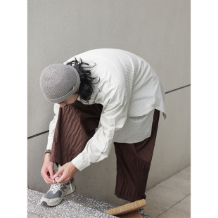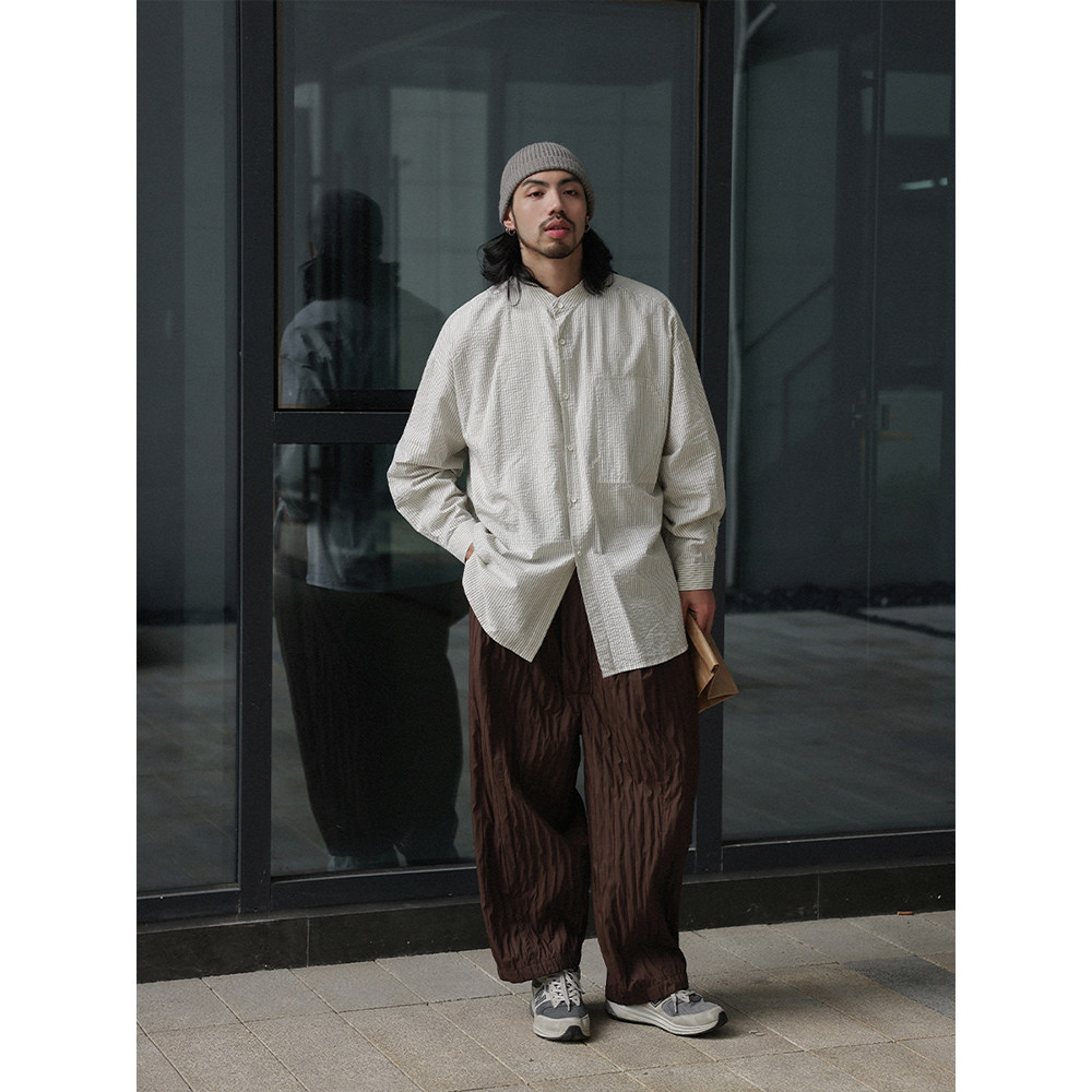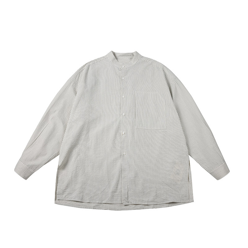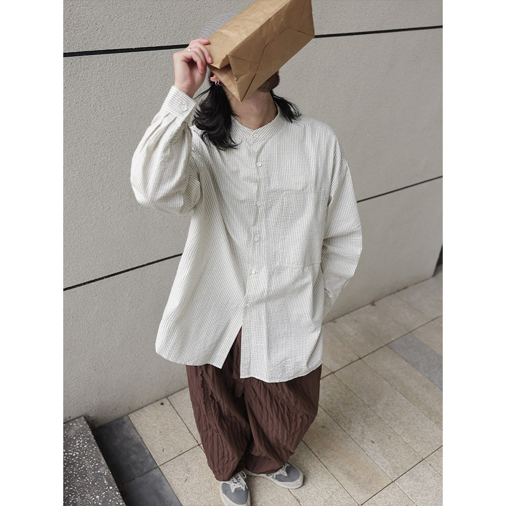 日系立领复古设计感贴袋衬衣 衬衫 NOEARS春秋白色条纹中长款 长袖