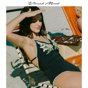 visual mood泳衣女复古盘花刺绣黑白遮肚显瘦连体温泉度假泳装