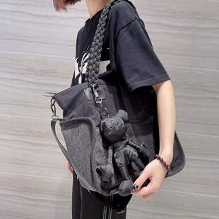 单肩包女潮2025新款 欧美风牛津大包简约复古手提斜挎包网布带挂饰