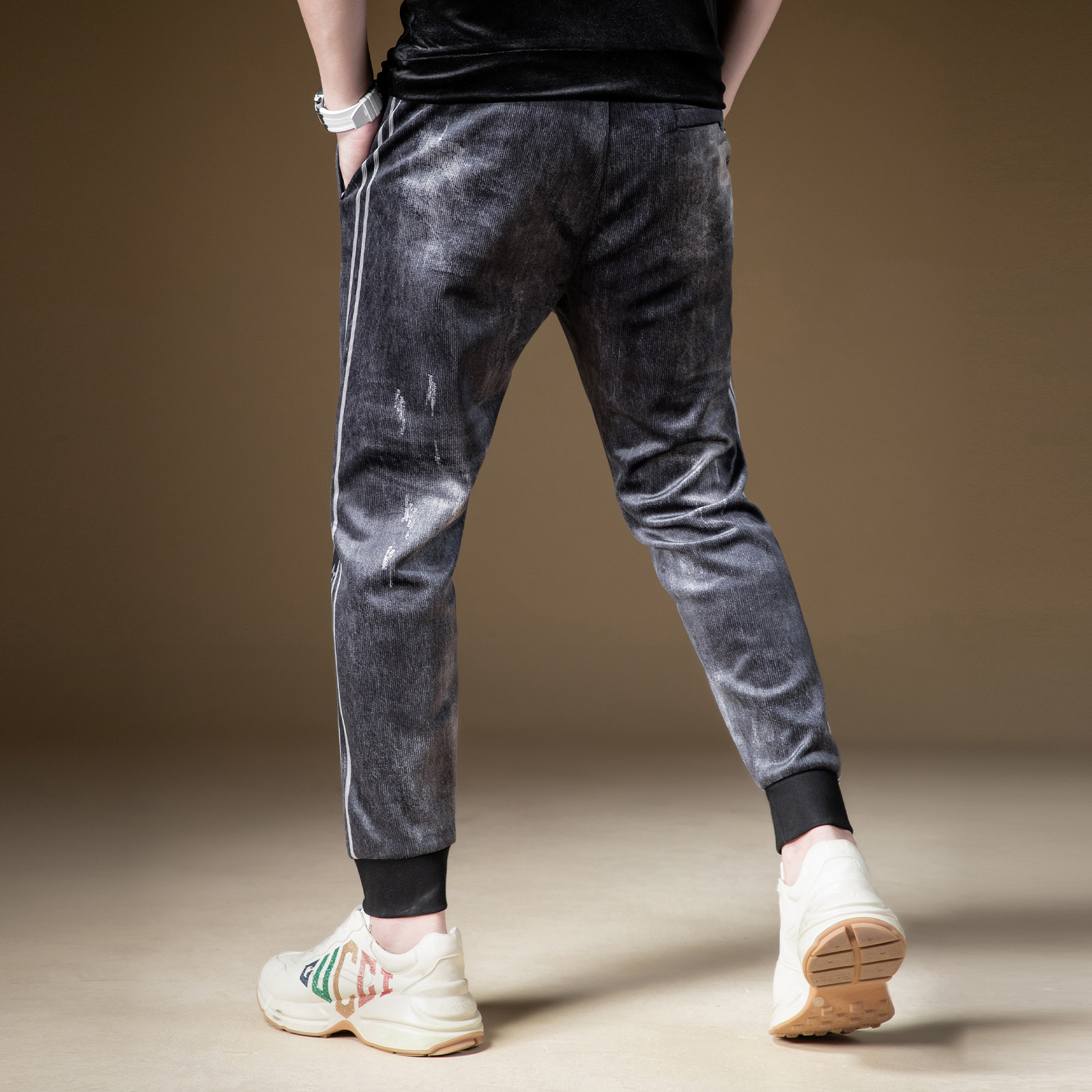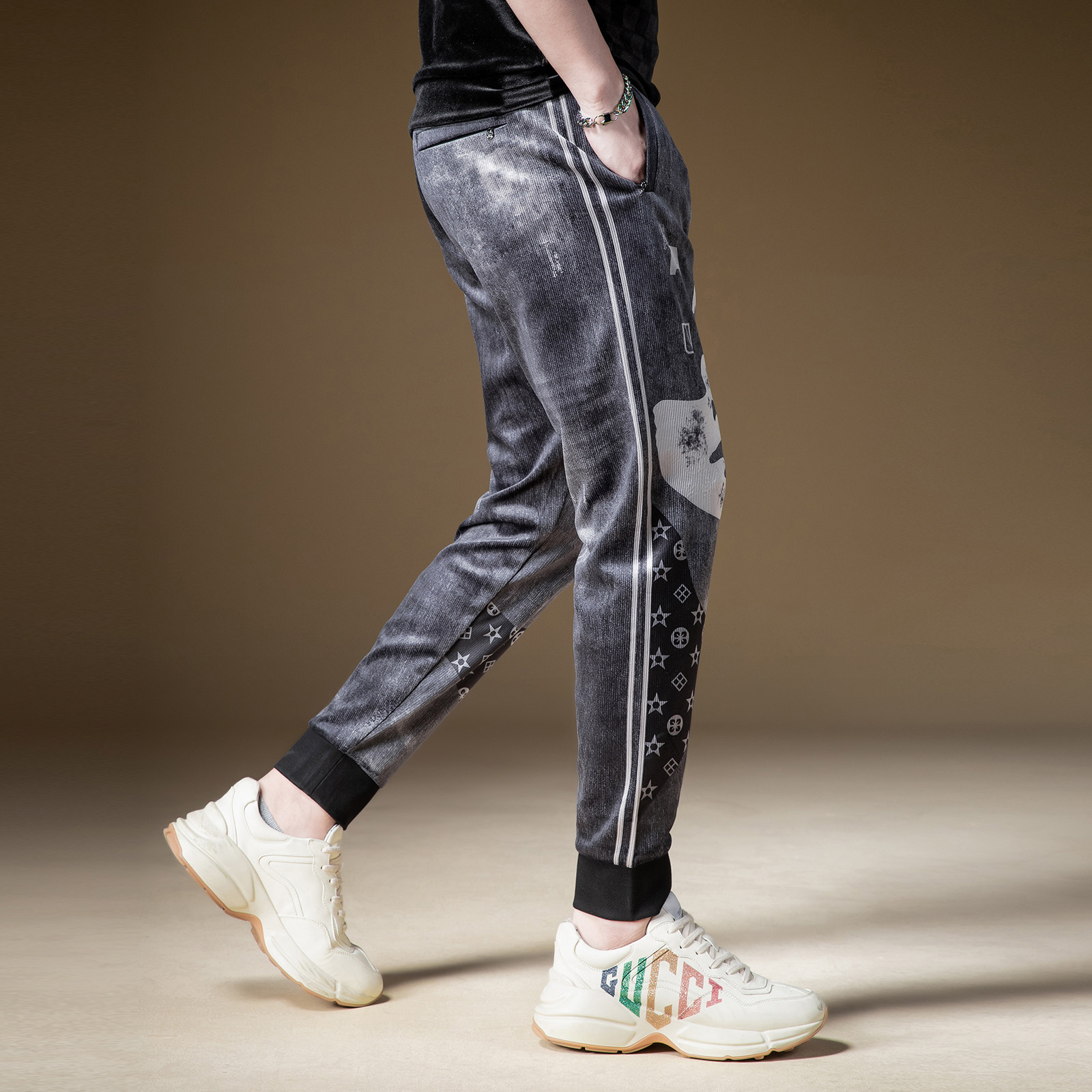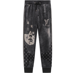 休闲运动卫裤 男士 子男ins潮炸街痞帅长裤 BM复古印花拼接烟灰色裤