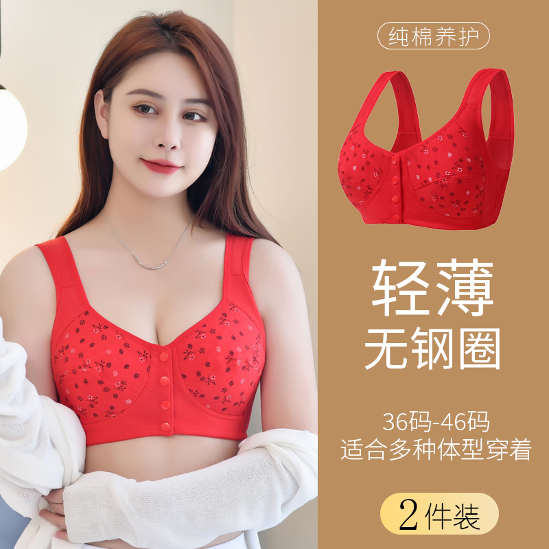 胸罩 大码 妈妈内衣文胸红色本命年前扣背心式 无钢圈纯棉中老年薄款