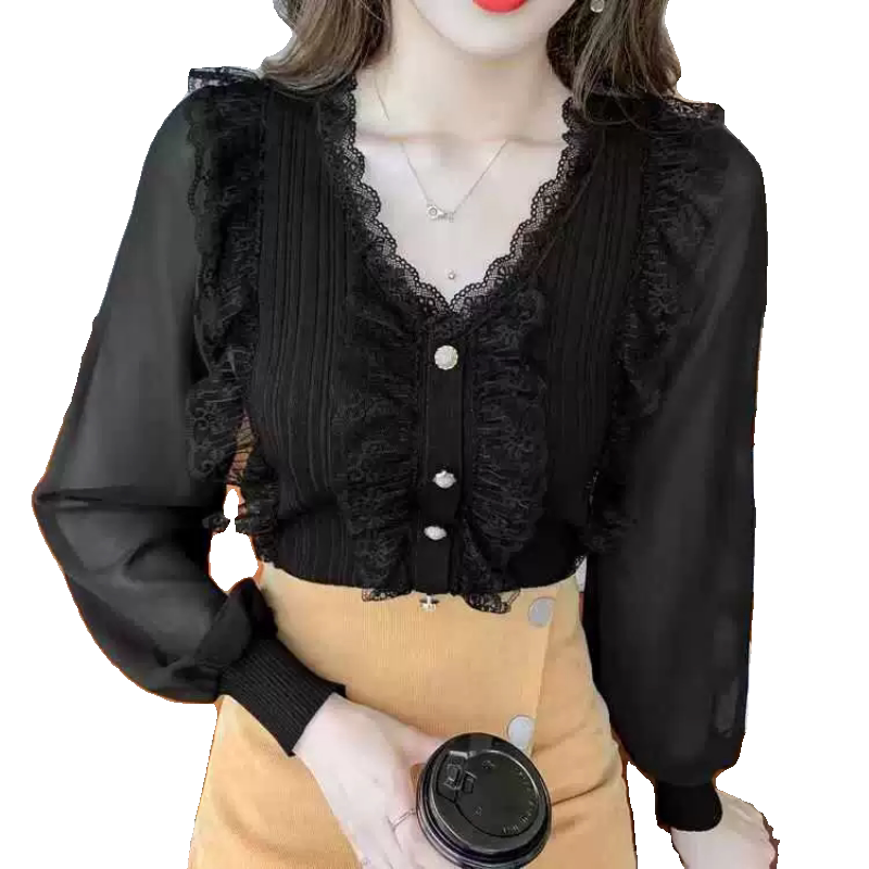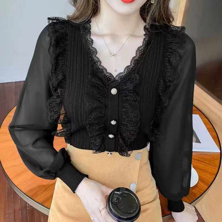 V领修身 网纱蕾丝拼接雪纺长袖 新款 女2024春秋季 显瘦上衣潮 针织衫