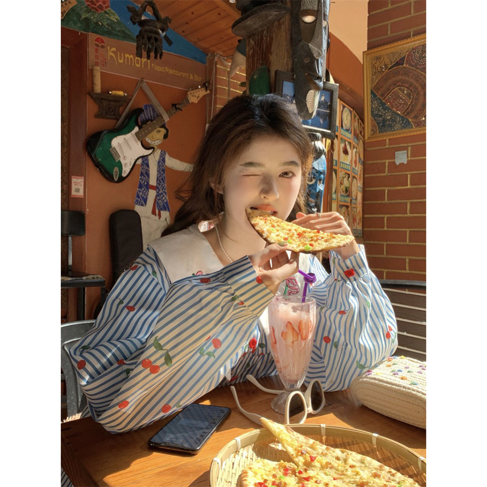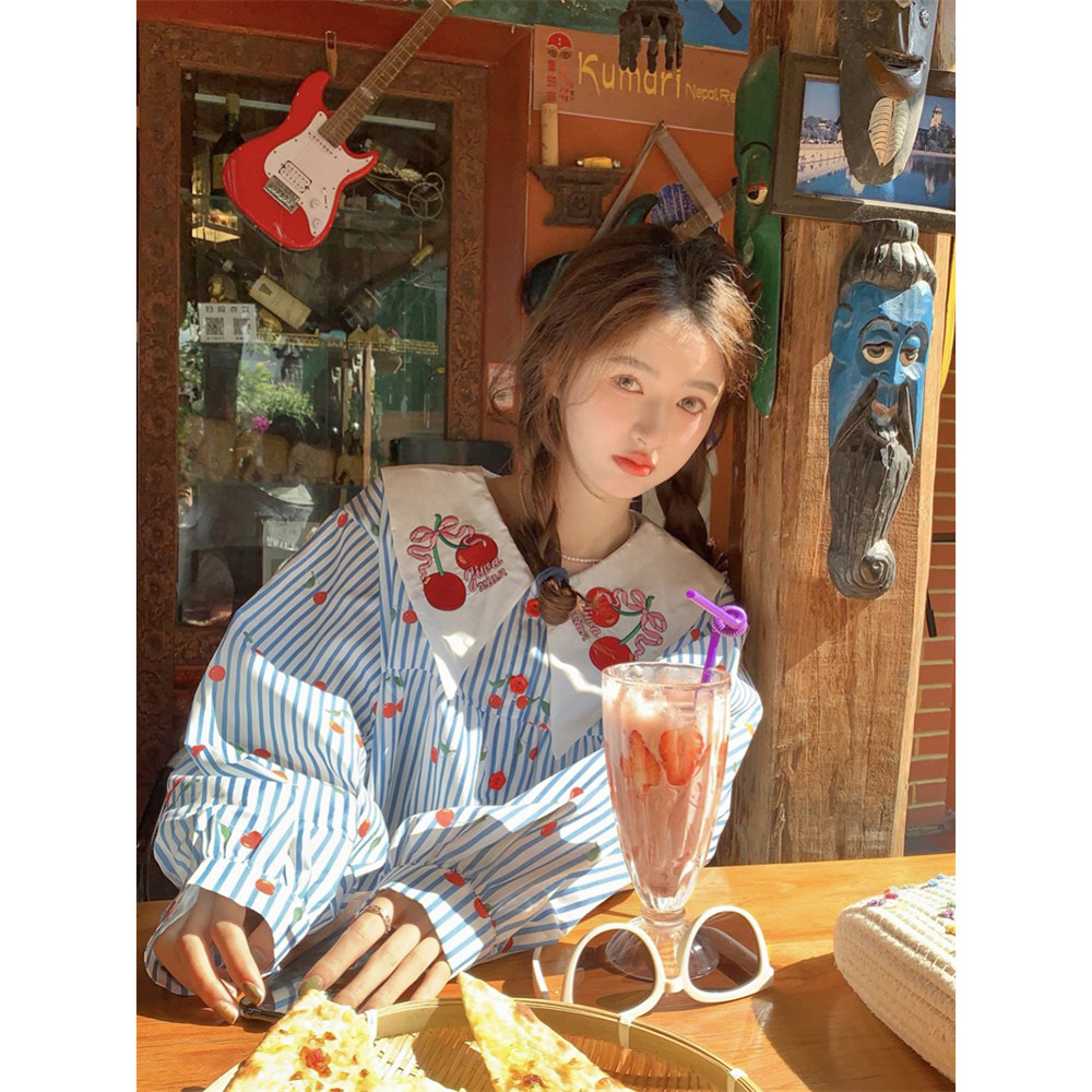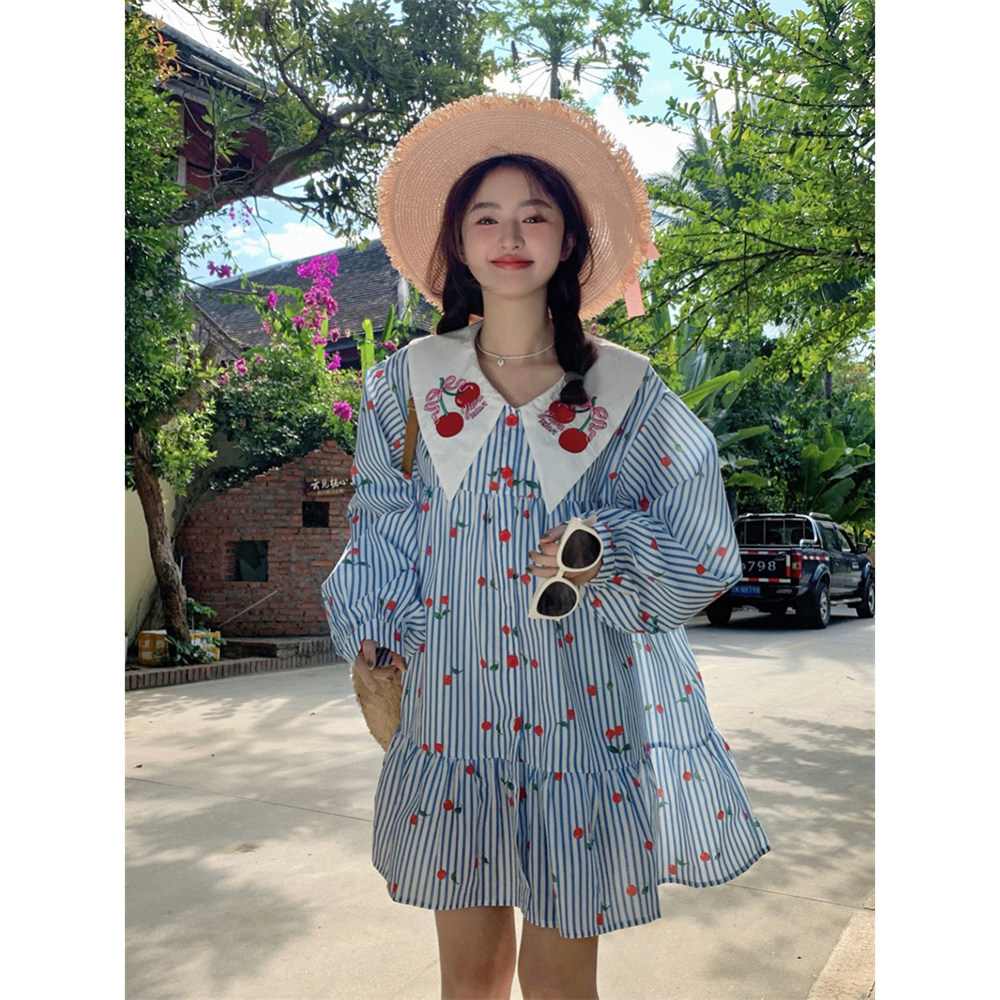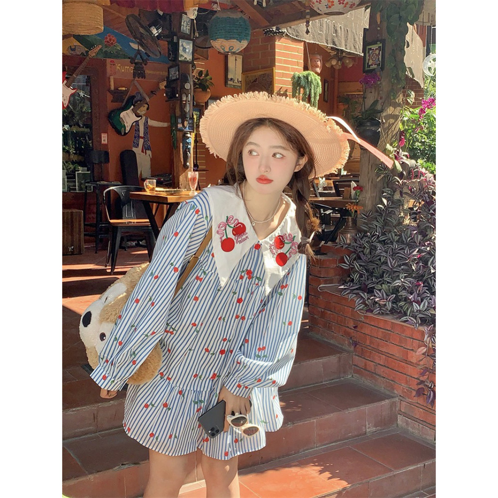 女春甜美短款 娃娃领条纹碎花衬衫 宽松A字裙子 海街日记 范雯雯