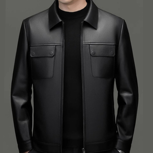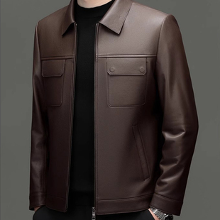 柔软头层绵羊真皮皮衣男加长款 翻领休闲简约商务尼克服夹克外套甘