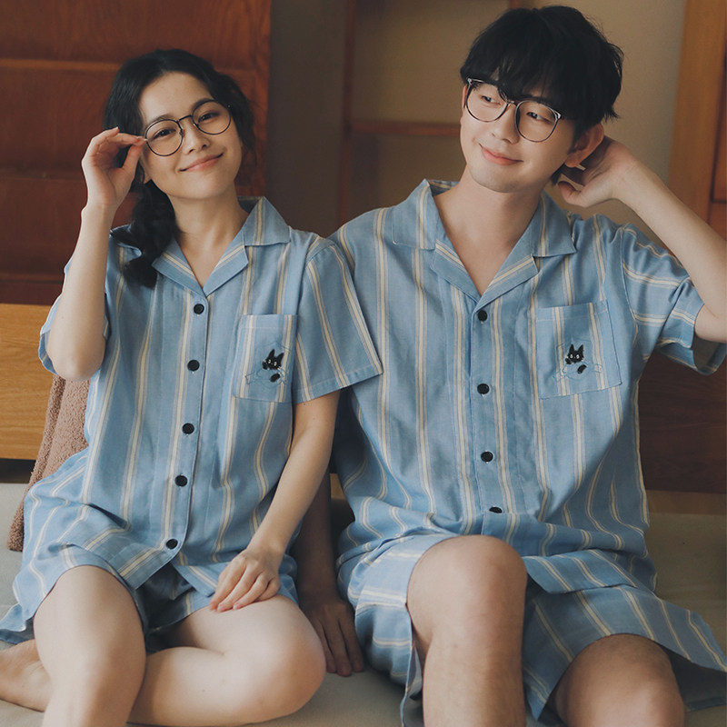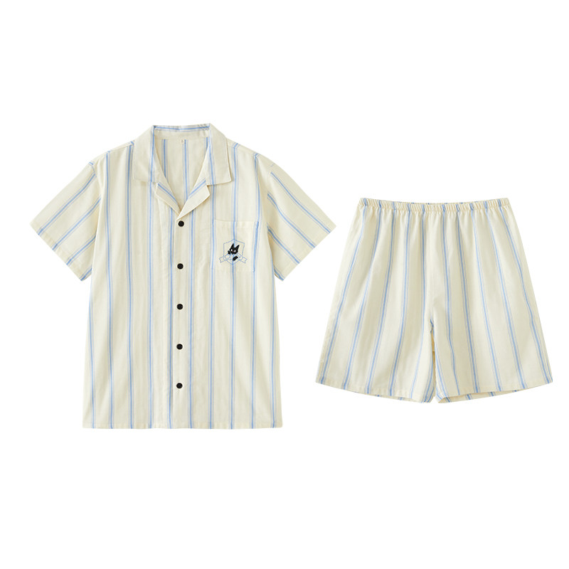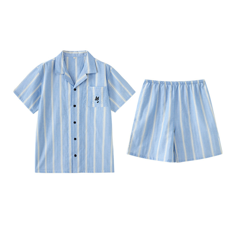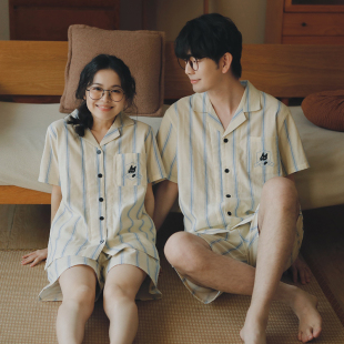 睡衣男女情侣可外穿家居服夏天 短裤 纯棉双层纱布薄款 简约条纹短袖