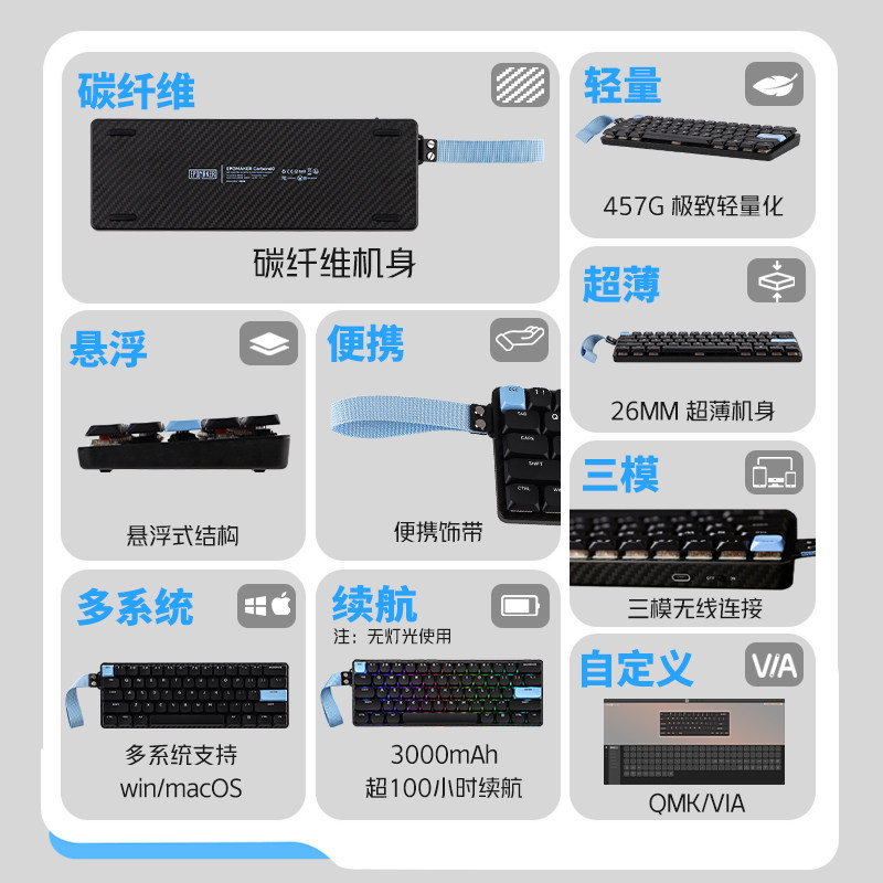 EPOMAKER Carbon60矮轴机械键盘碳纤维超薄无线蓝牙便携办公平板