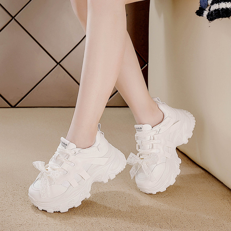 蕾丝蝴蝶结透气增高运动休闲小白鞋 新款 女2026春季 7CM厚底老爹鞋
