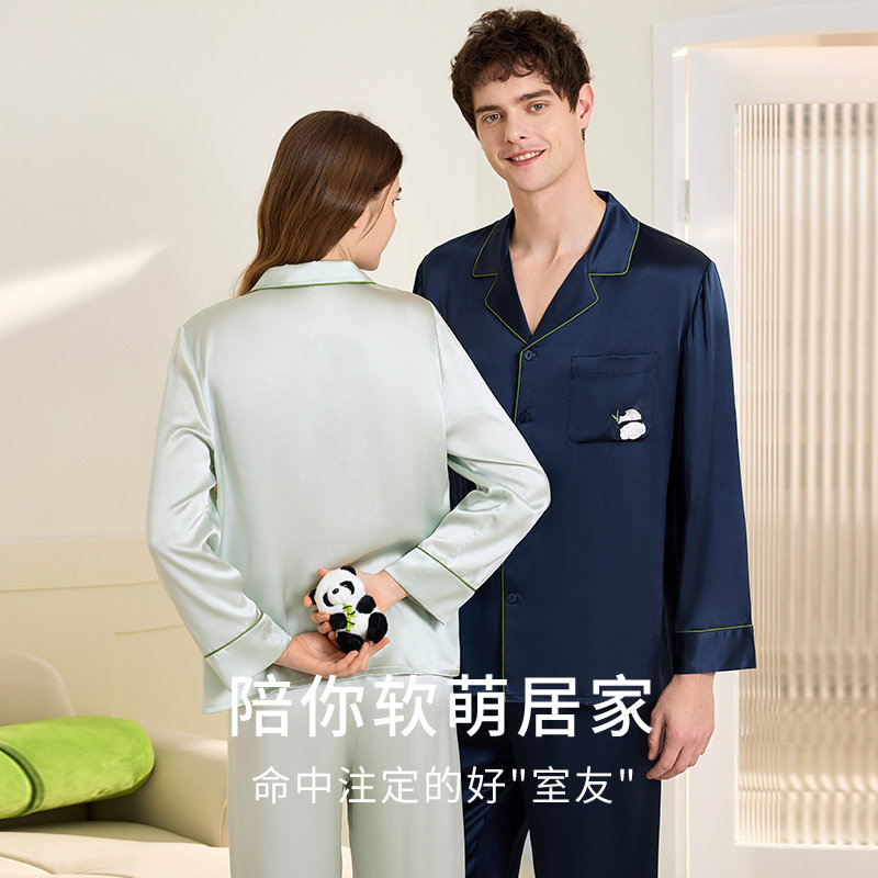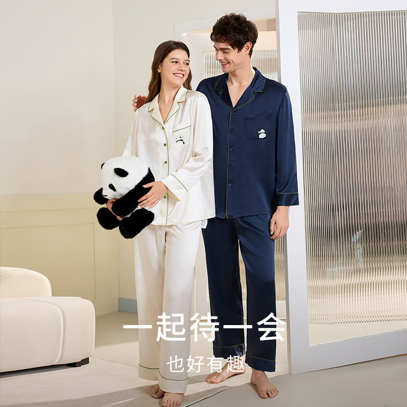 重磅真丝睡衣女熊猫刺绣送礼礼物情侣家居服男金三塔100%蚕丝睡衣