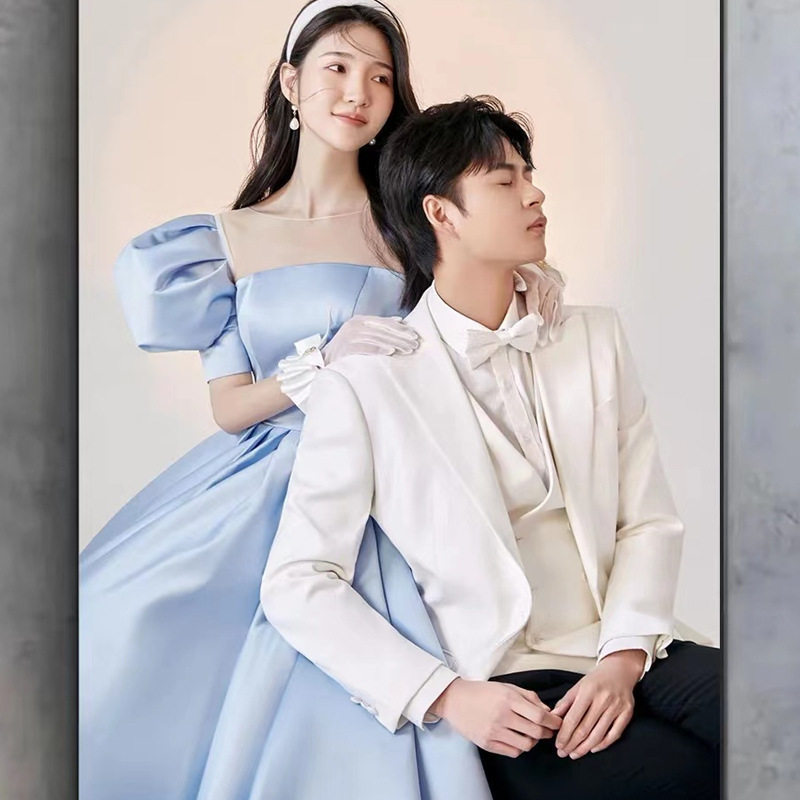 蓝色短袖 韩版 草坪 浑身影楼主图摄影礼服情侣装 室内户外长拖尾新款