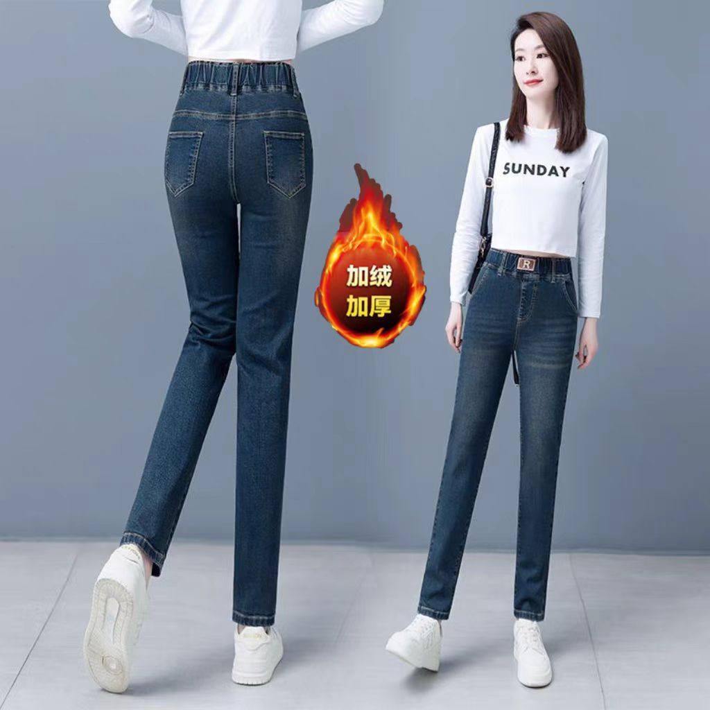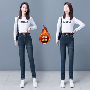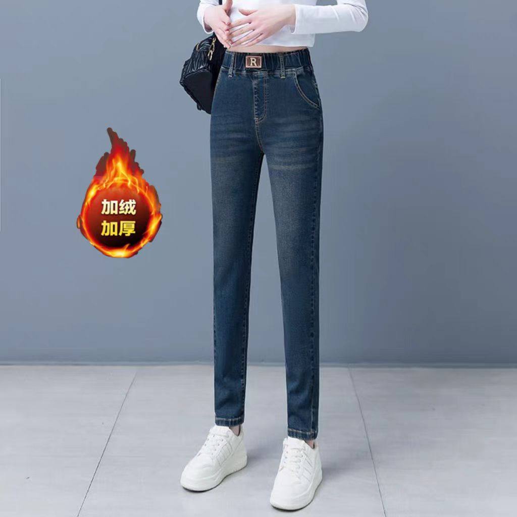 秋冬弹力显瘦小脚铅笔裤 女2025年新款 加绒加厚牛仔裤 松紧高腰单裤