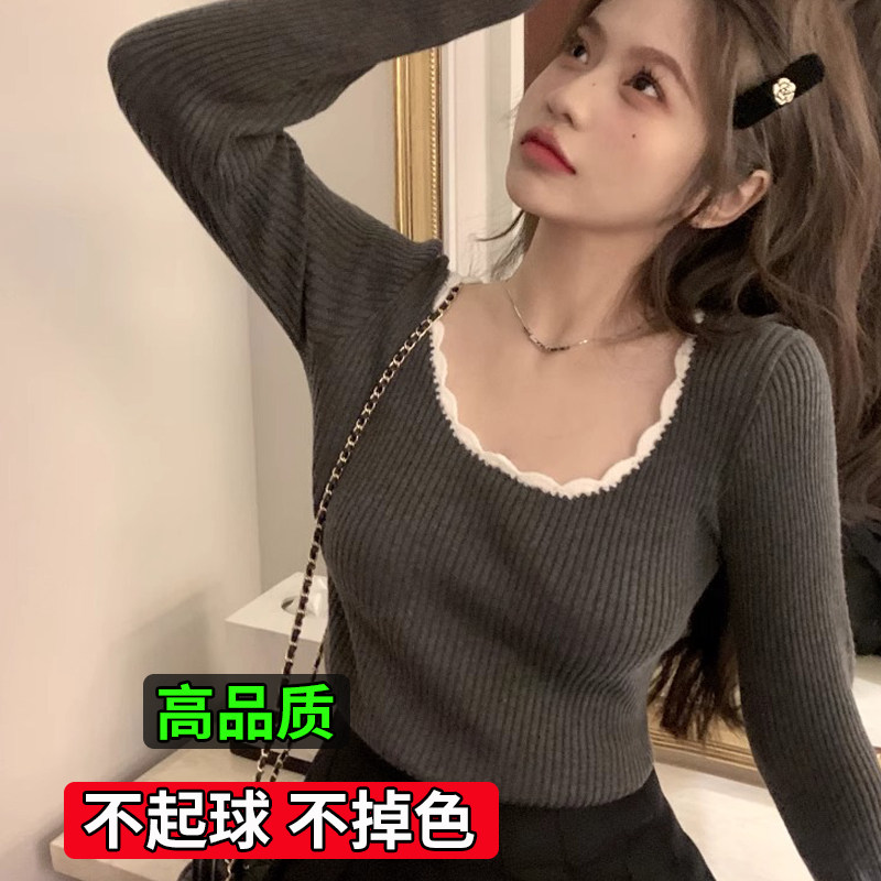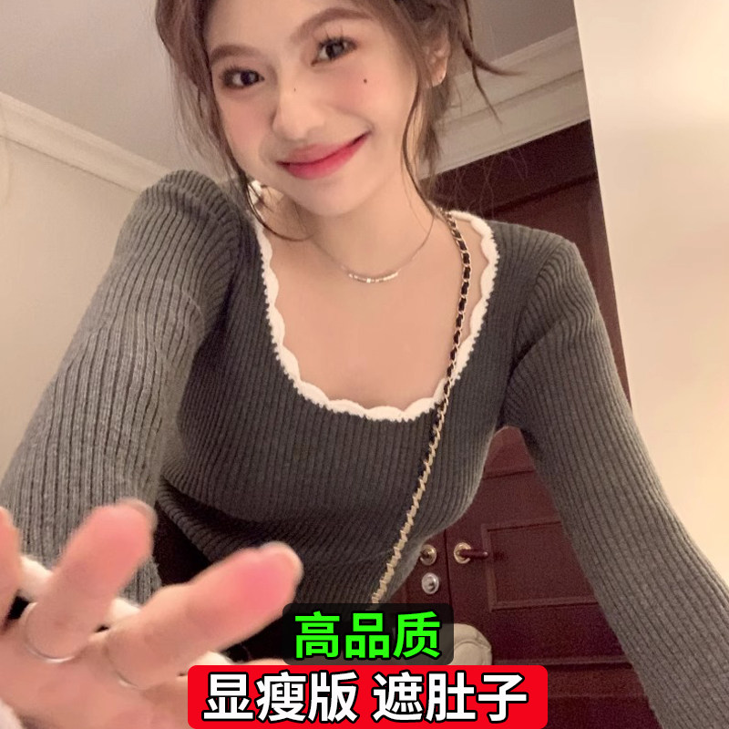 毛衣软糯上衣 女春秋内搭高级感修身 大码 胖mm大圆领撞色打底针织衫