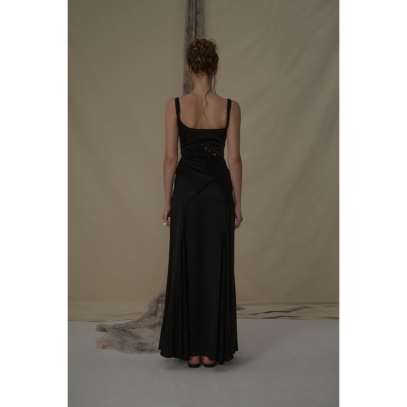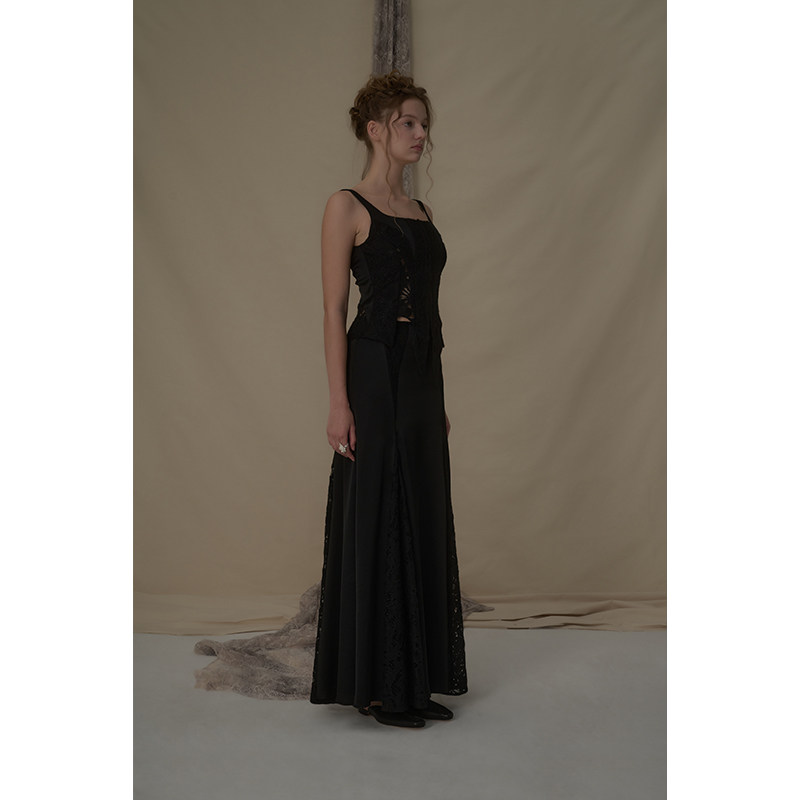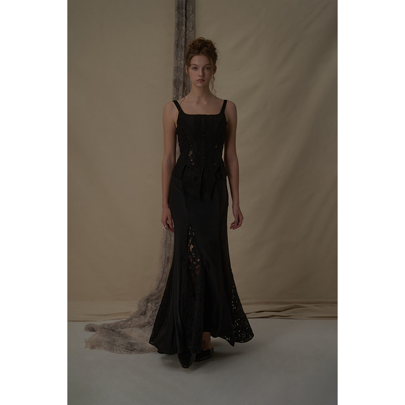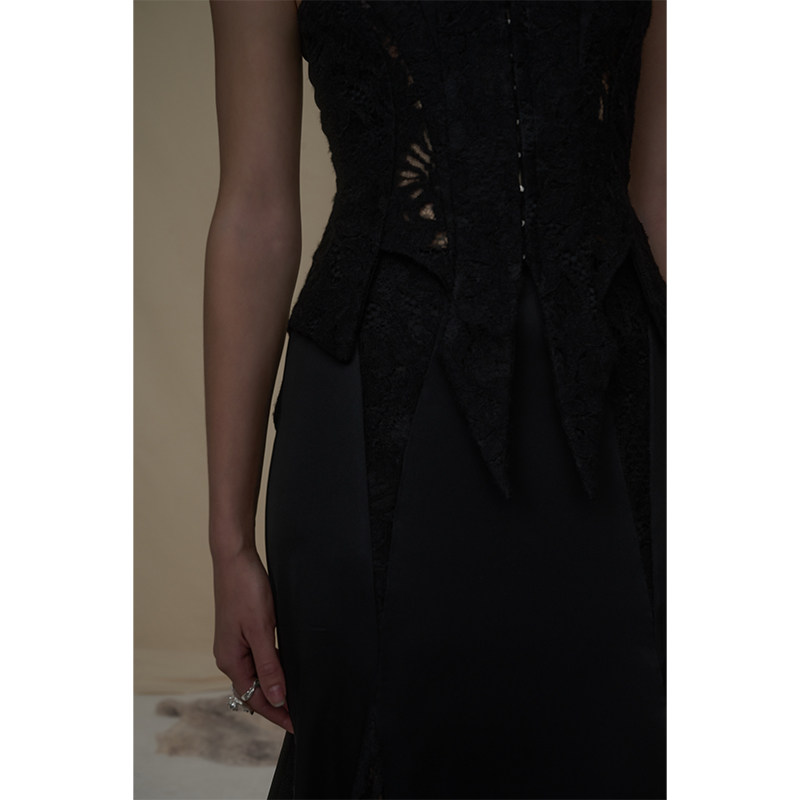 Elywood黑色蕾丝分割醋酸马甲镂空显瘦低领上衣小众原创设计内搭