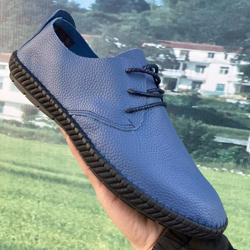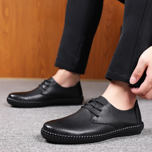 男 软底手工缝制鞋 头层牛皮透气圆头系带男鞋 休闲低跟日常黑色皮鞋