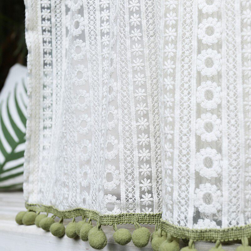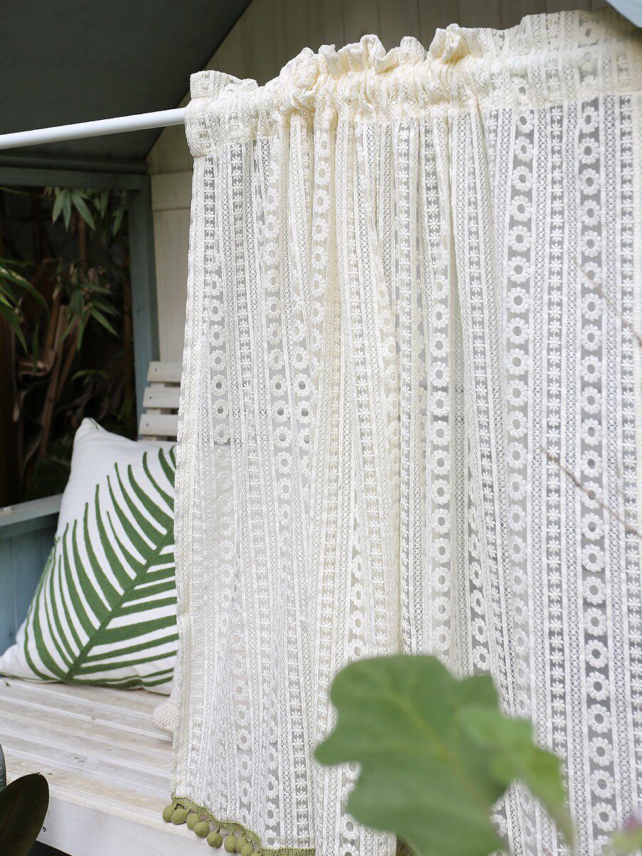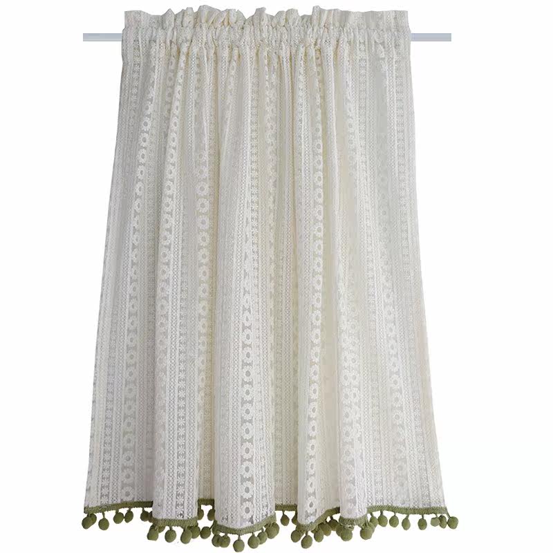 鸢尾乡旅蕾丝毛球文艺ins风北欧穿杆柜门帘半帘帘头短帘免打孔帘