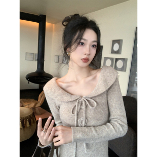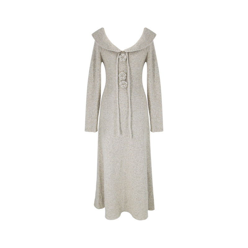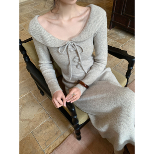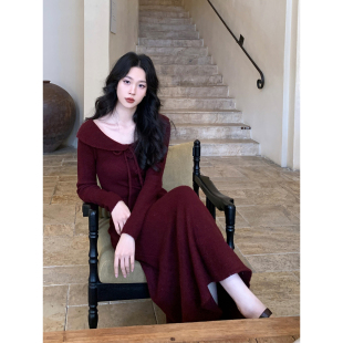 新款 羊毛针织连衣裙女冬季 小翻领收腰长裙 荷叶边收腰修身 SYT自制