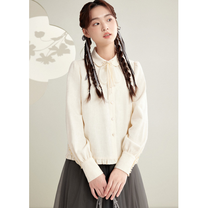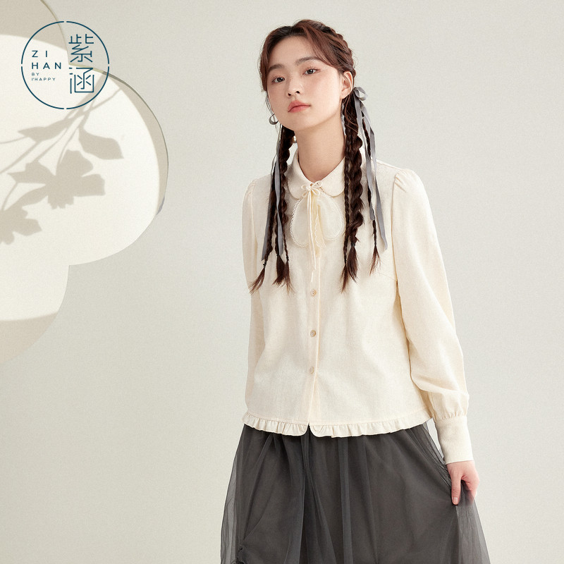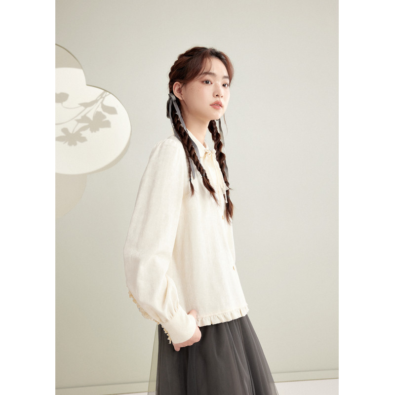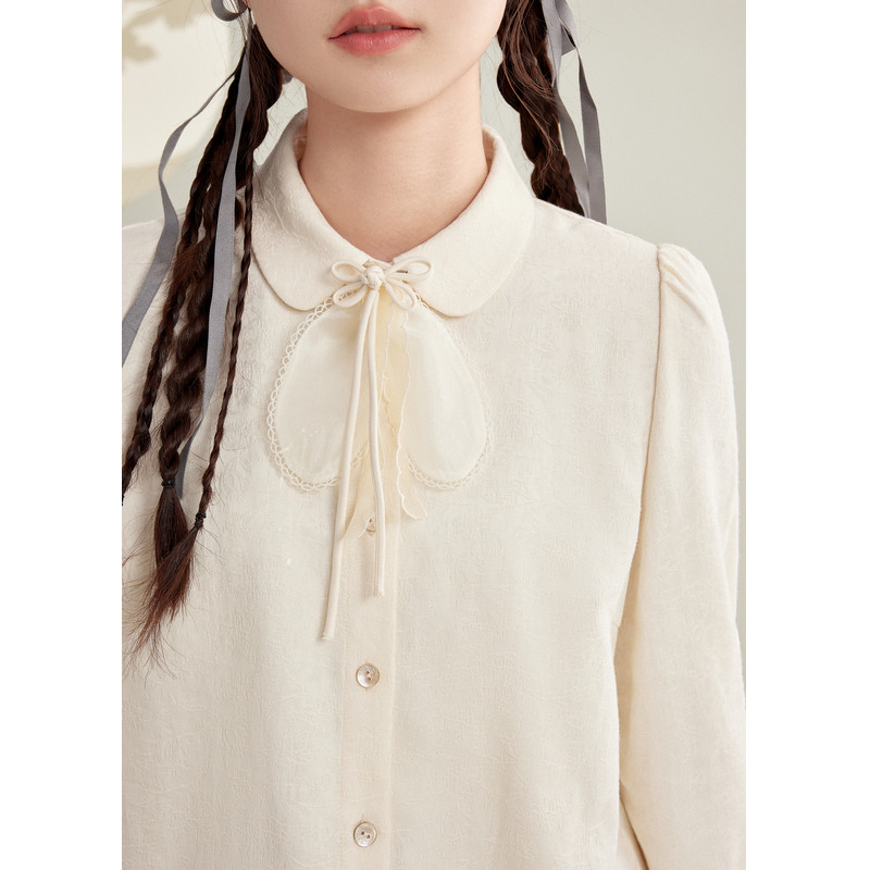 新款 女春秋季 甜美盘扣领结暗纹休闲上衣 衬衫 紫涵木耳边翻领灯笼袖