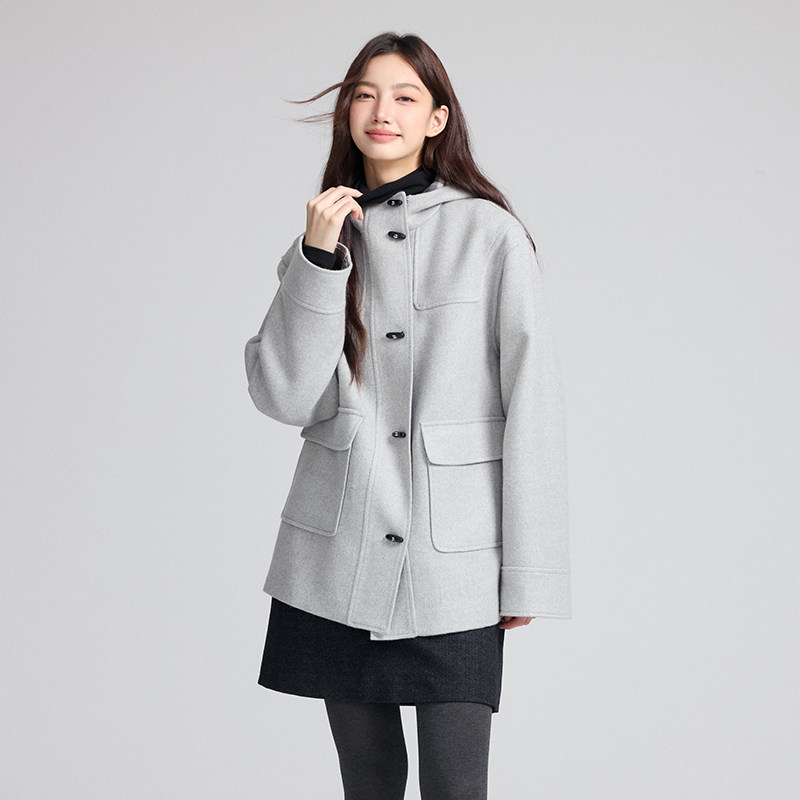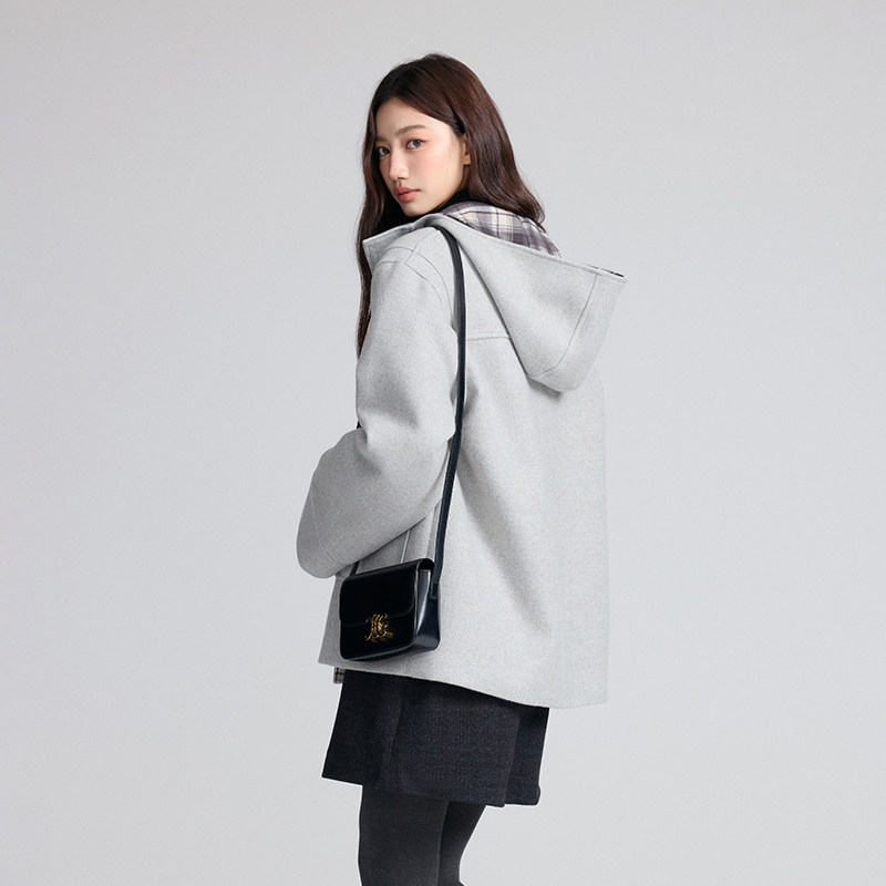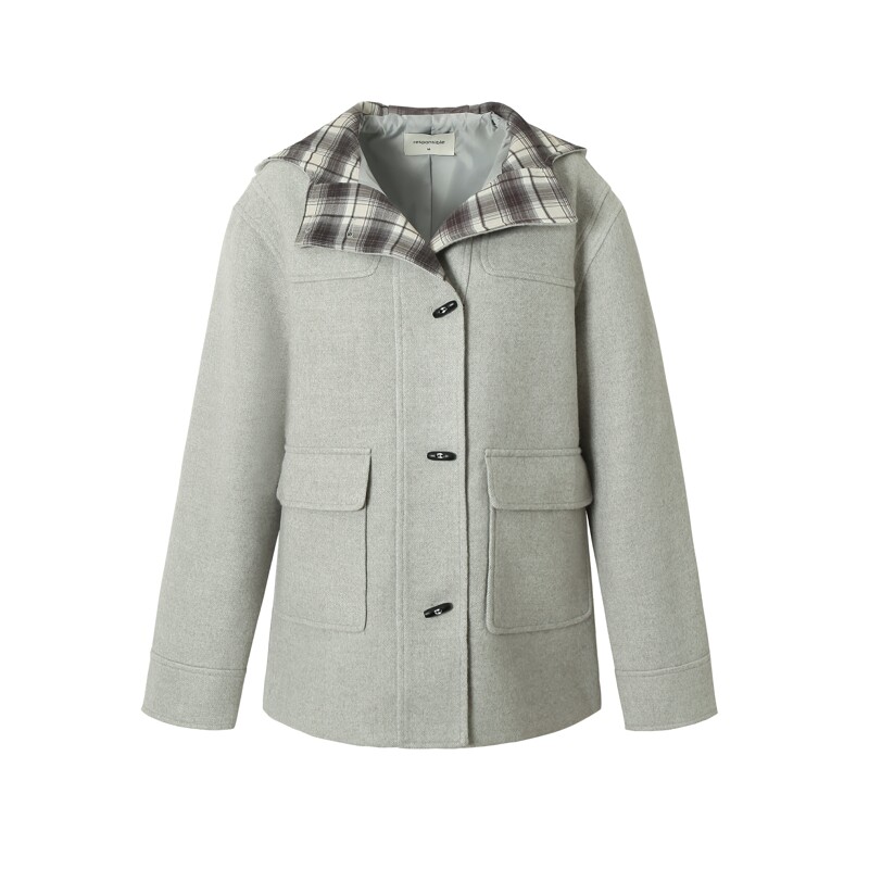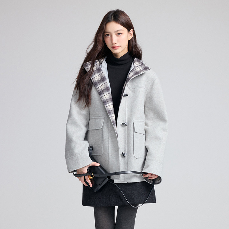 格纹拼接连帽牛角扣设计感毛呢中长款 新款 外套女大衣 Brand RPB