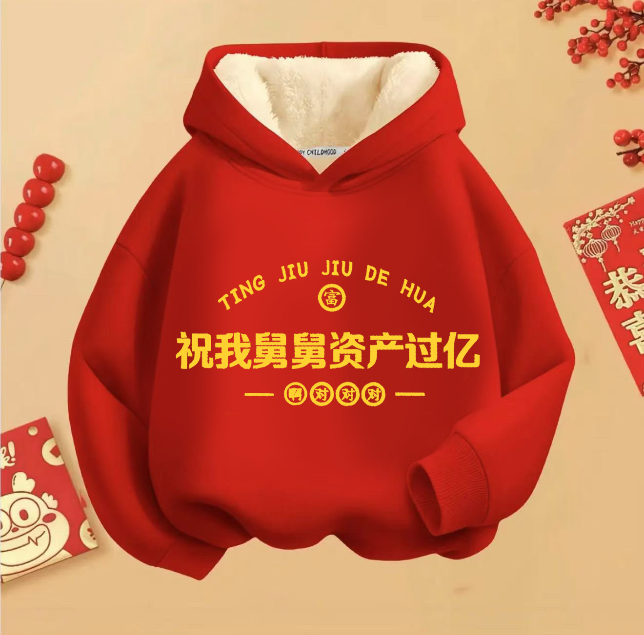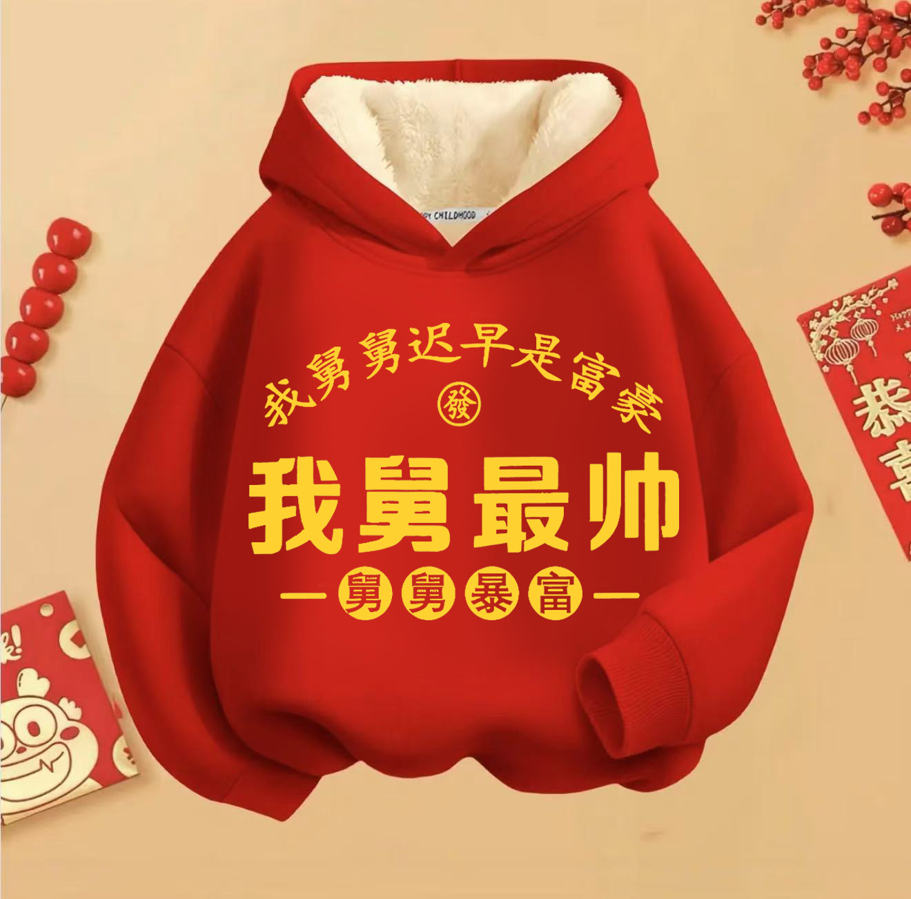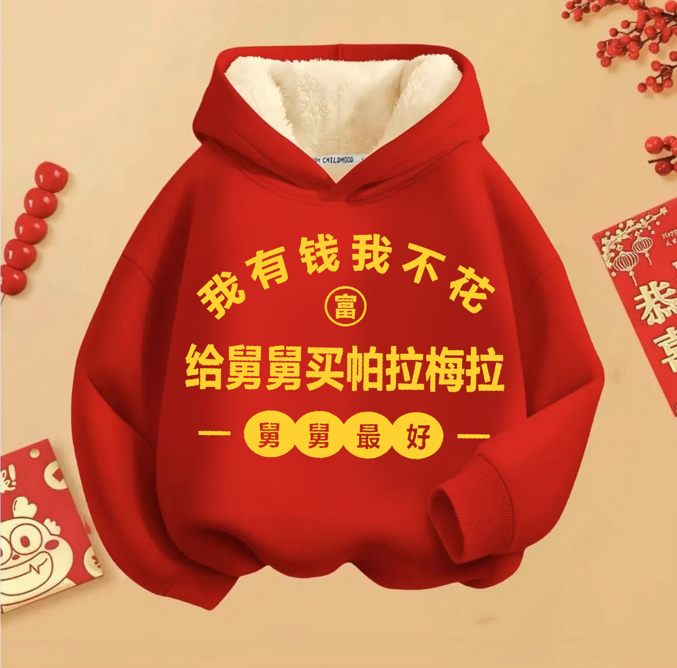 我爱舅舅暴富国潮秋冬加绒连帽卫衣男女童长袖 上衣儿童喜庆拜年服