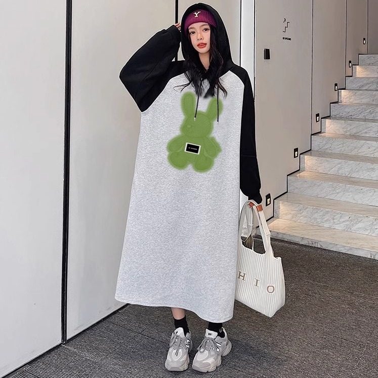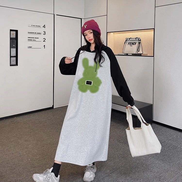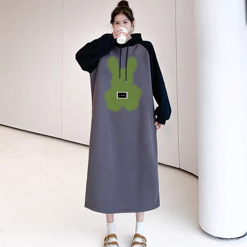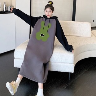 宽松显瘦孕妇连衣裙 韩版 2024时尚 撞色拼接卡通连帽卫衣裙早秋新款