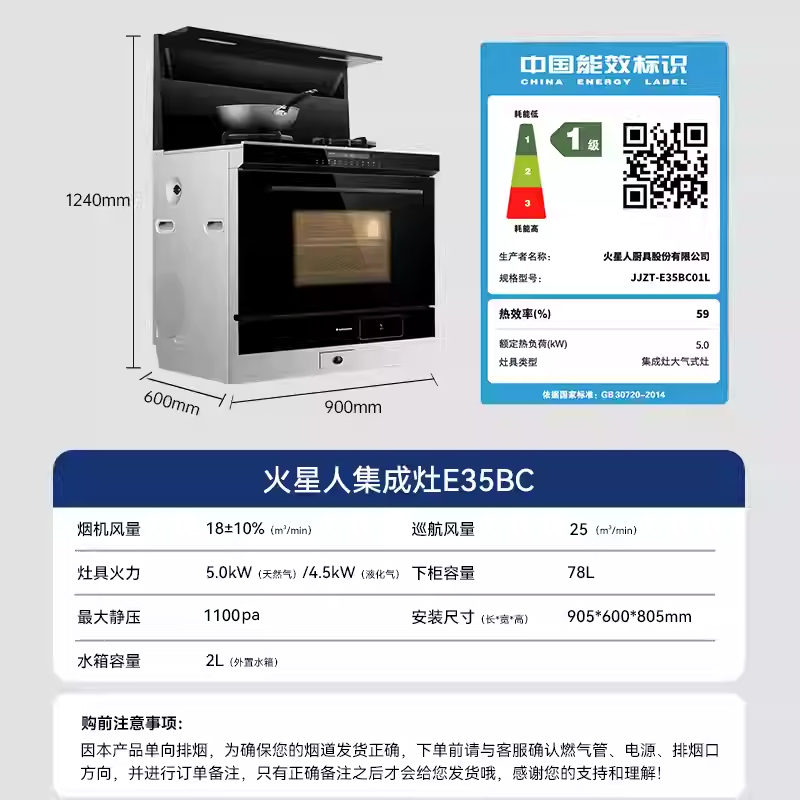 火星人E35BC轻风系列集成灶蒸烤箱一体家用灶台燃气灶 重磅升级