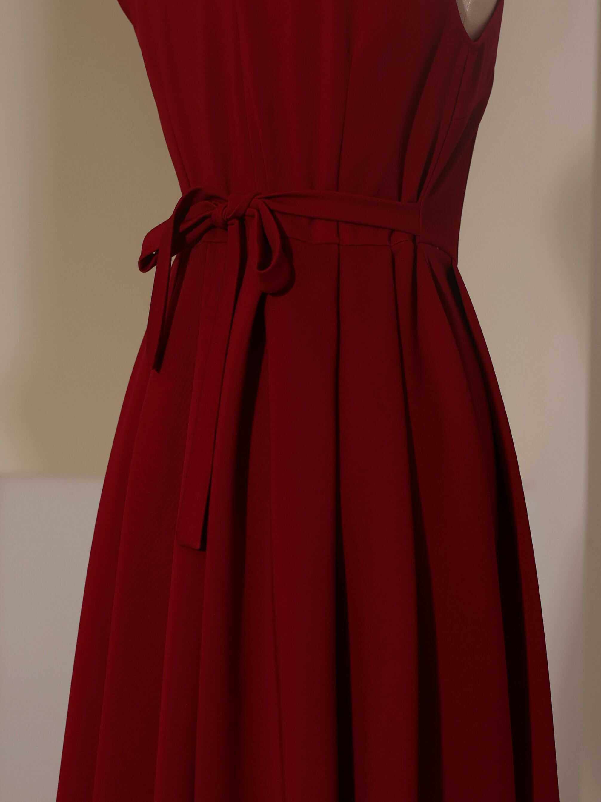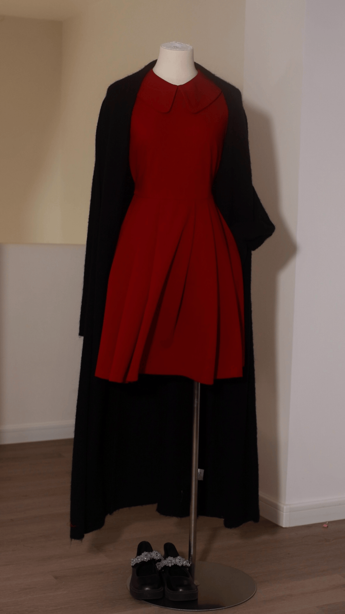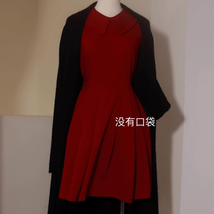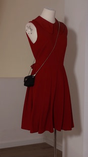 红色打底连衣裙女春秋 收腰公主裙小个子短款 喵吉法式 复古翻领无袖