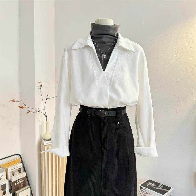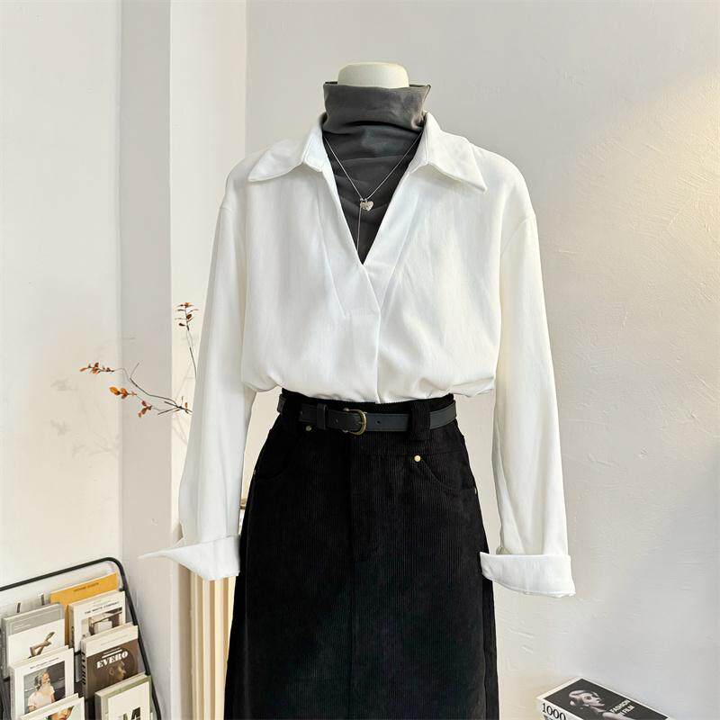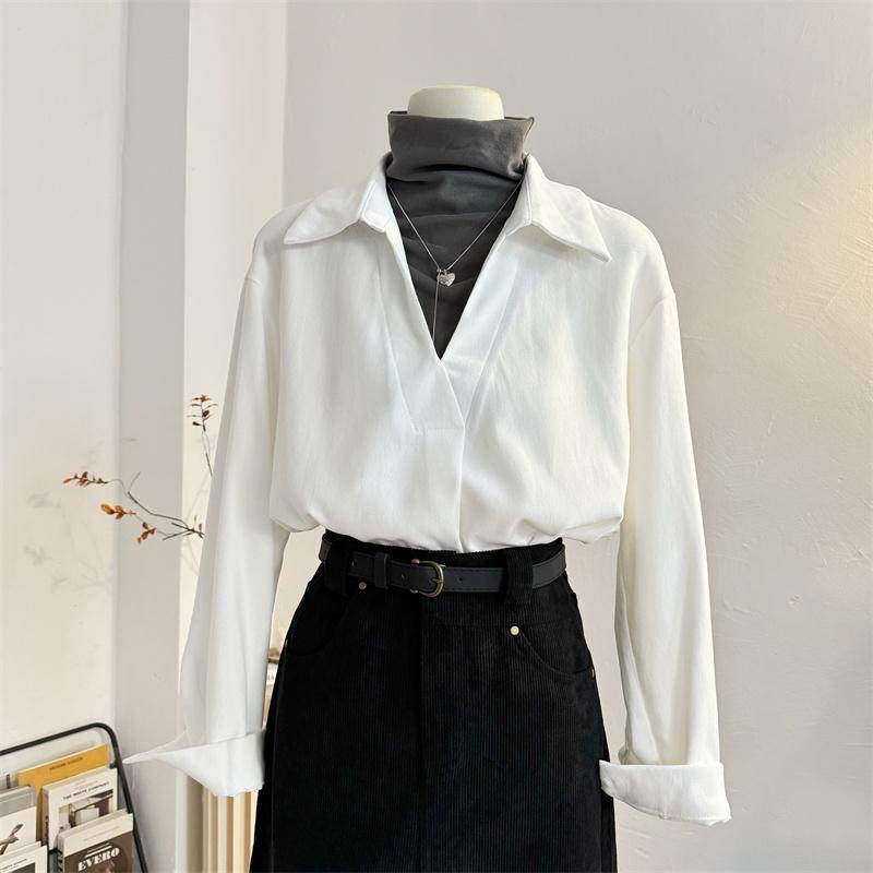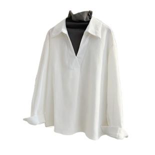 白色假两件高领磨毛加厚衬衫 女秋冬宽松休闲内搭叠穿衬衣港风上衣