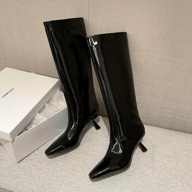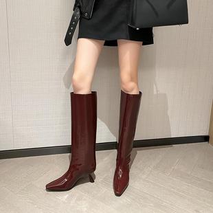 6cm猫跟方头不过膝长靴女高筒时装 头层牛漆皮 法式 新款 靴 2024秋季