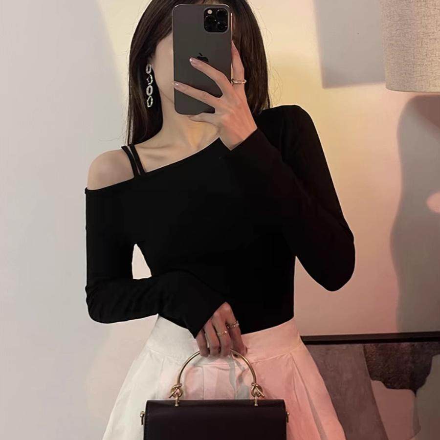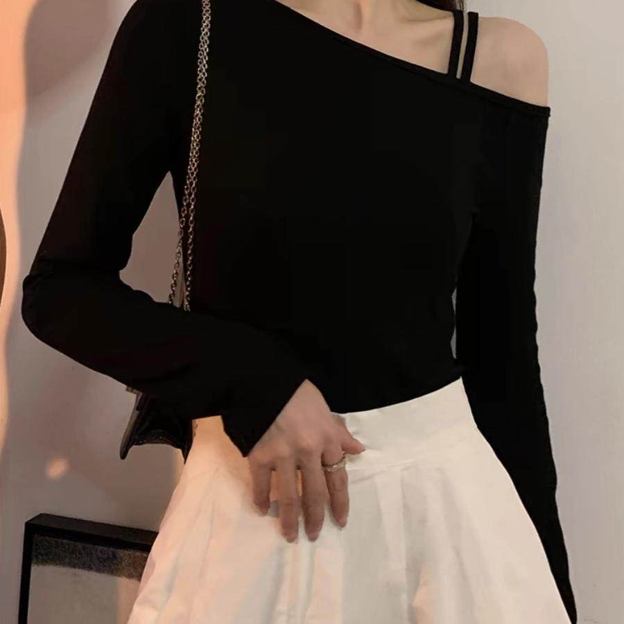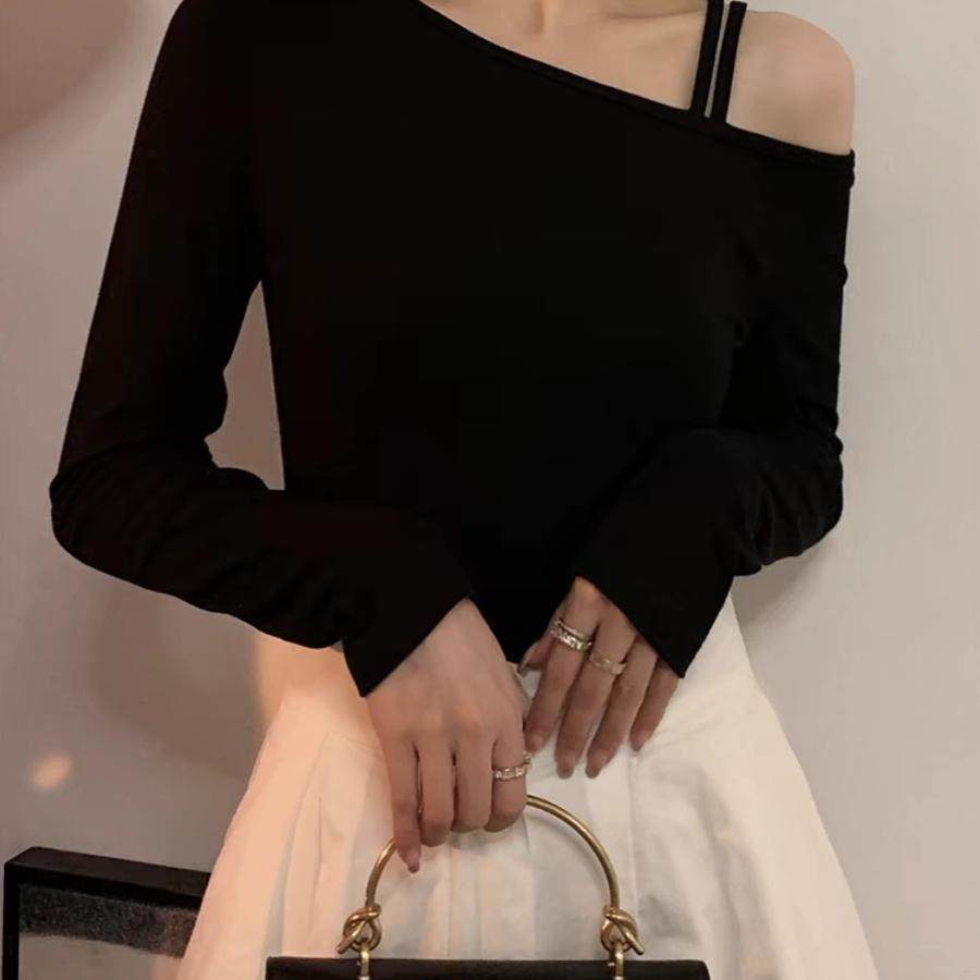 露肩T恤 斜肩打底衫 黑色一字肩上衣女秋季 辣妹锁骨设计感小众长袖