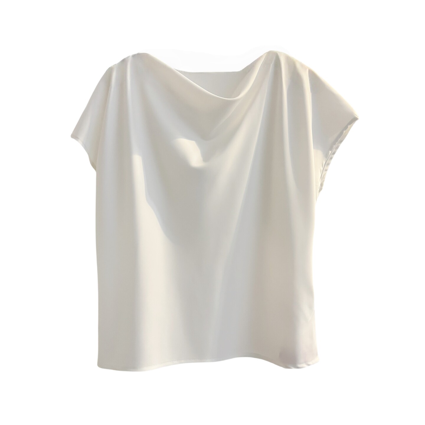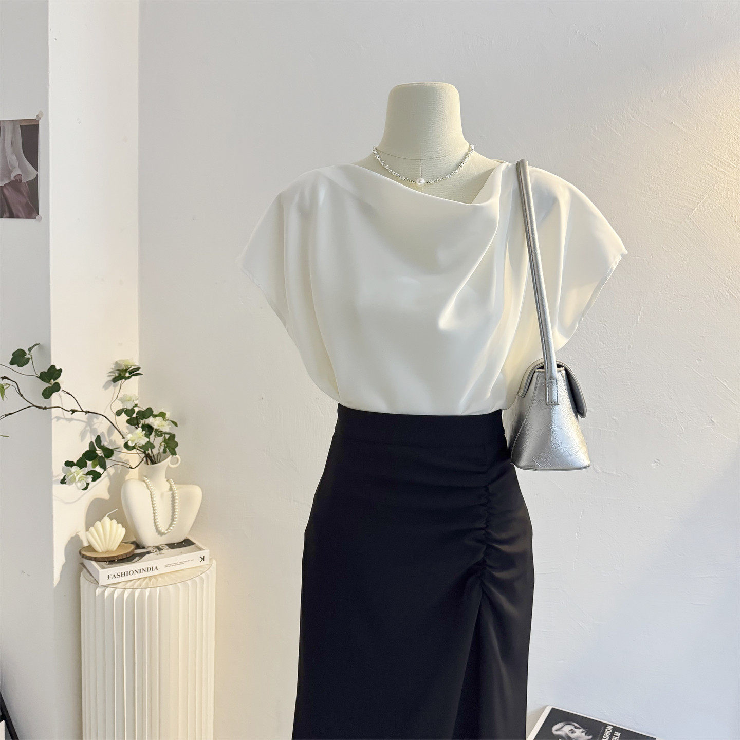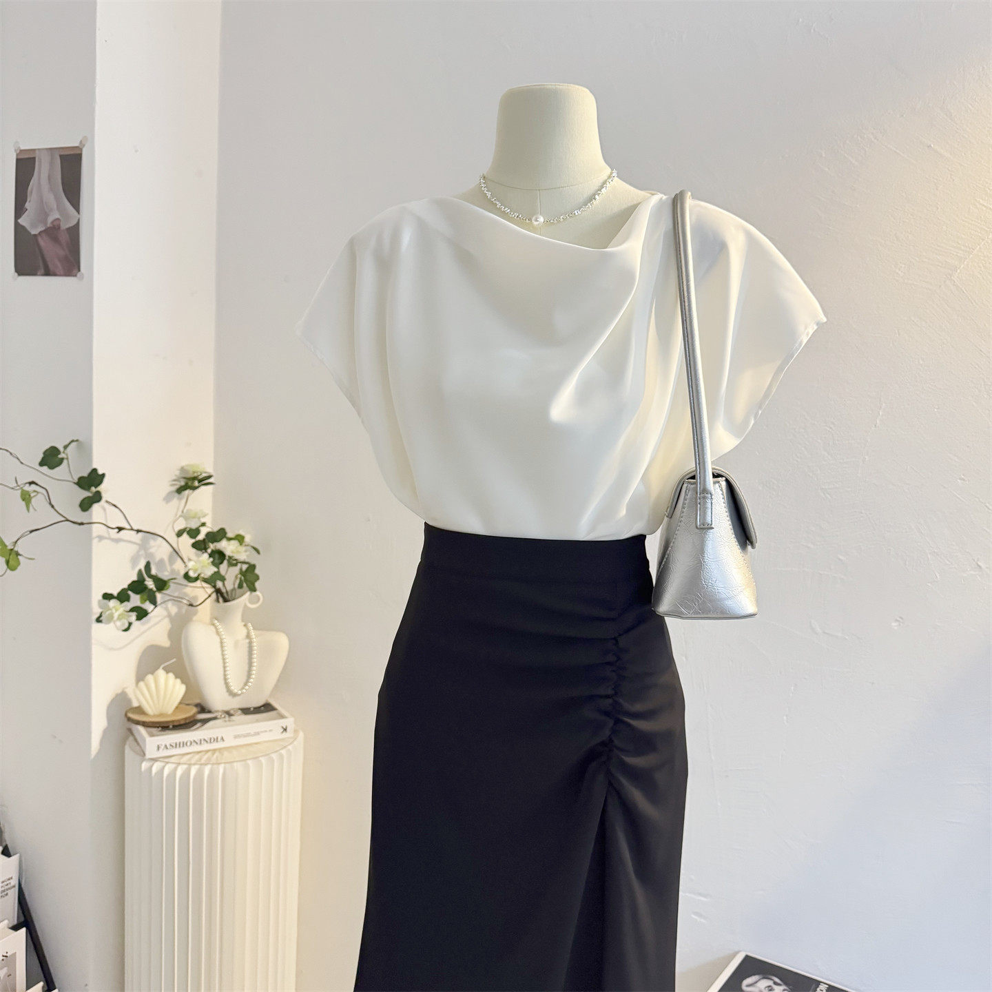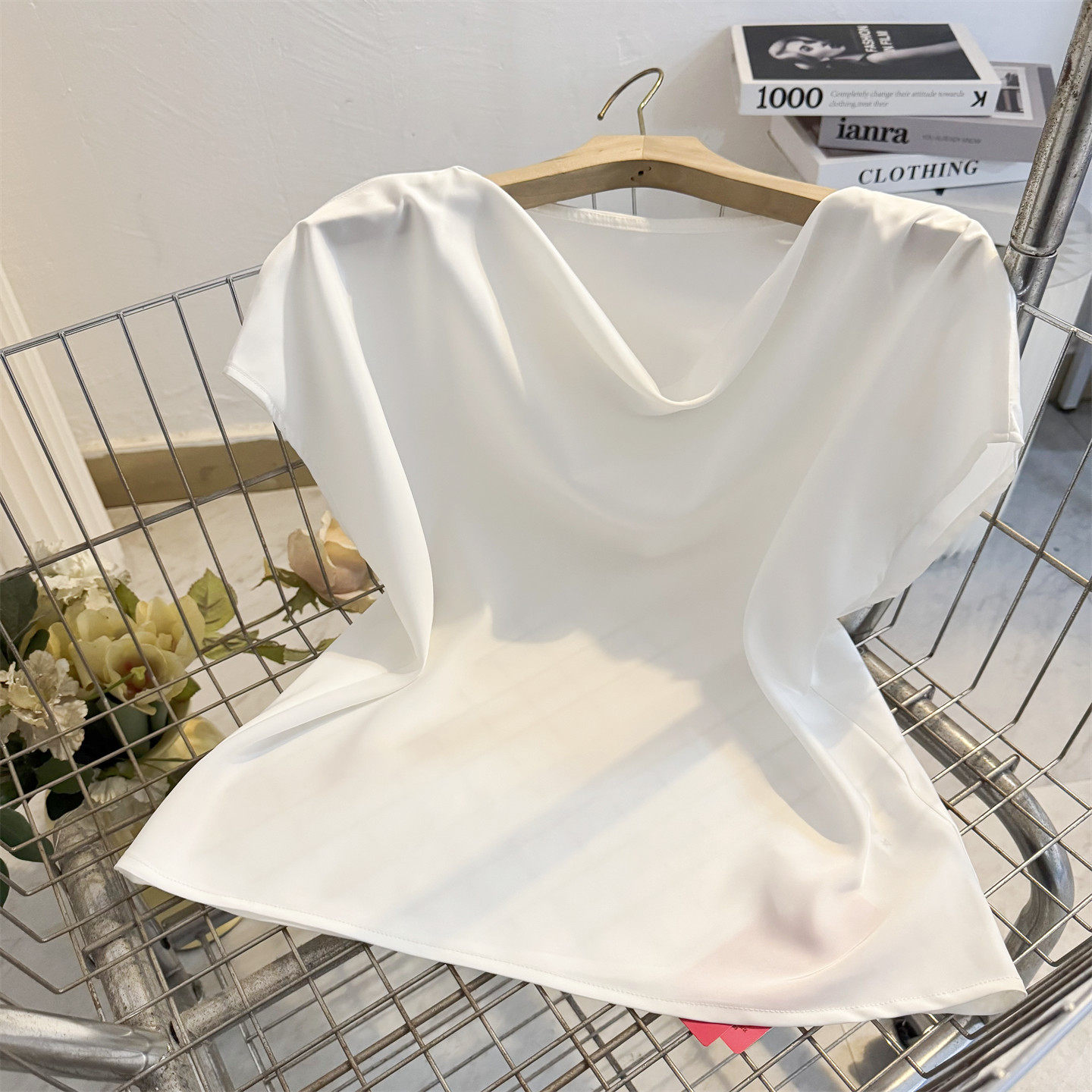 女2025夏季 衬衫 设计感宽松通勤气质衬衣小众上衣 荡领缎面短袖 法式