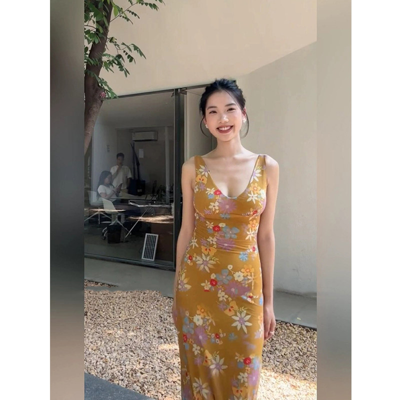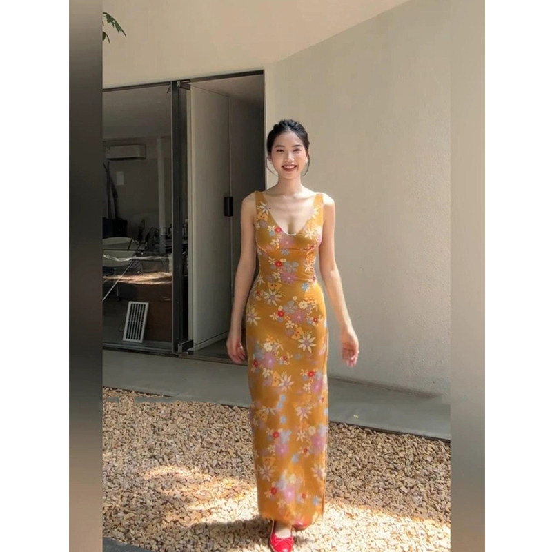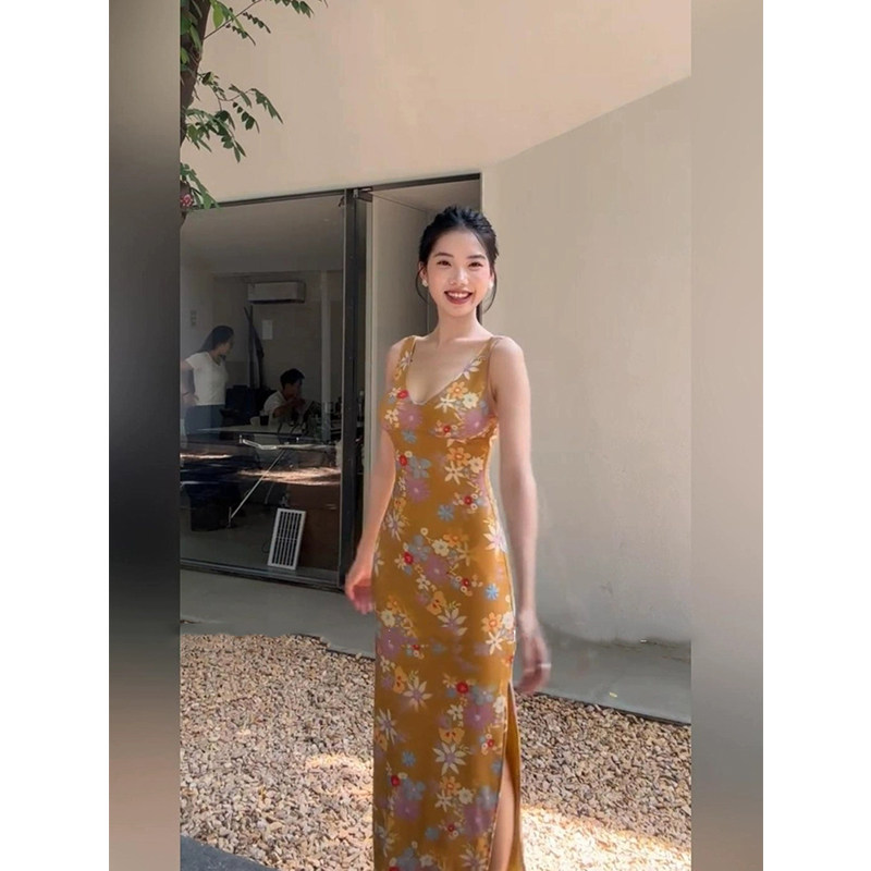 收腰开叉长裙 度假风V领黄色印花吊带裙女25年夏修身 XZY 微胖法式
