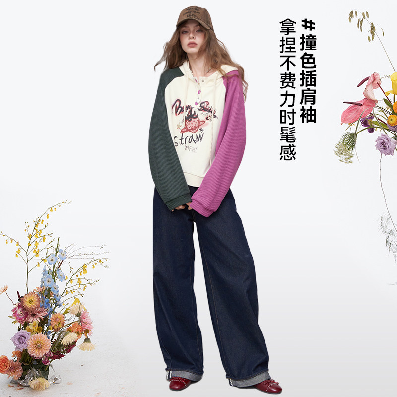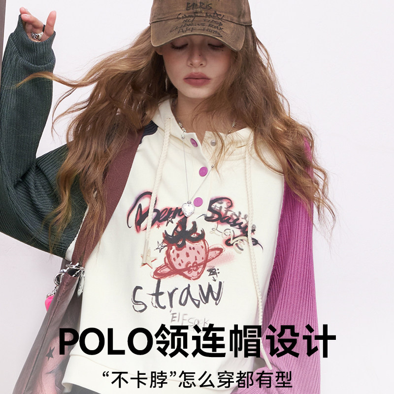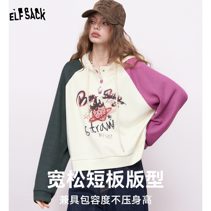 上衣 小个子短款 妖精 口袋撞色插肩草莓印花圆领卫衣女2026春新款