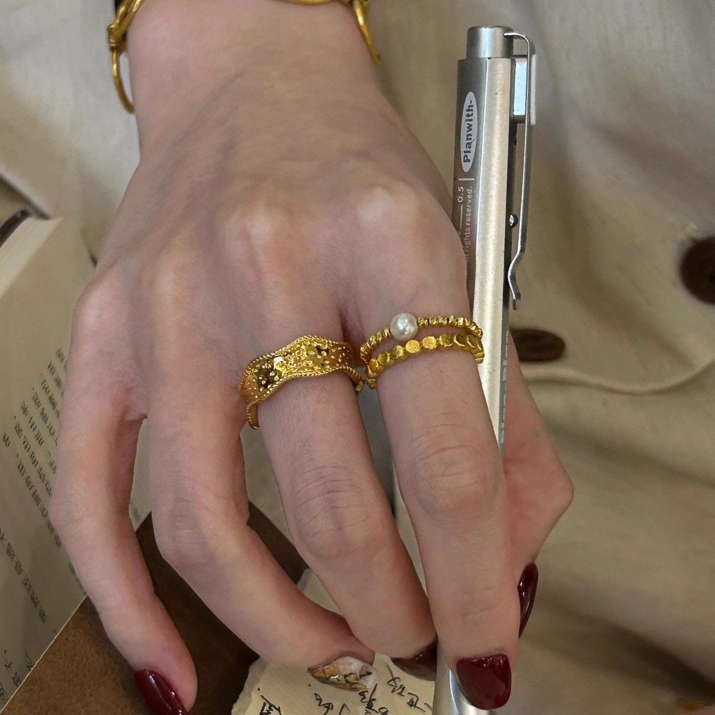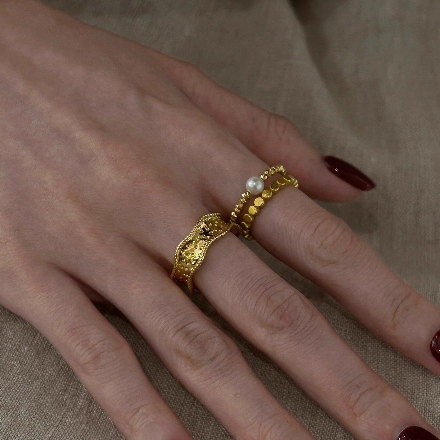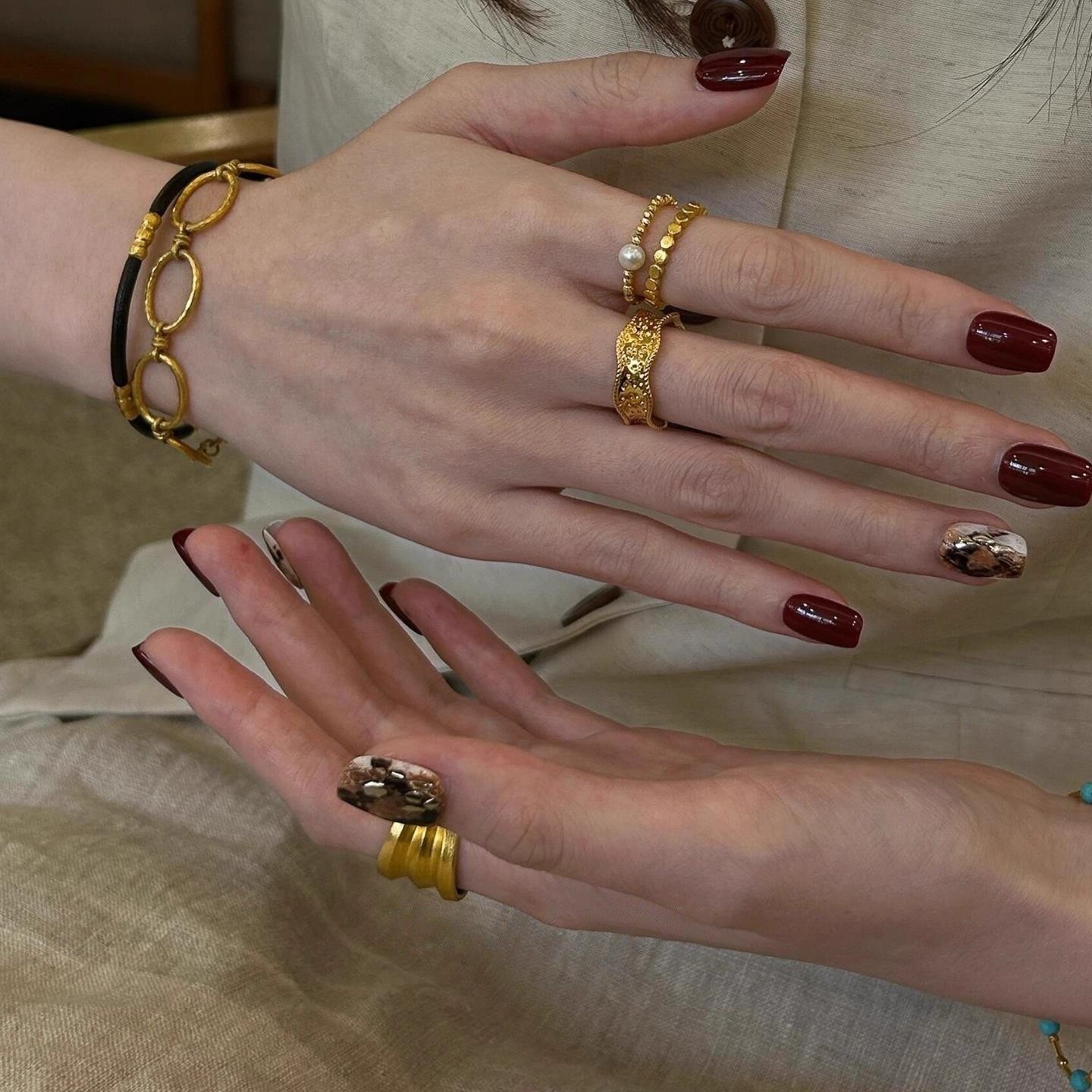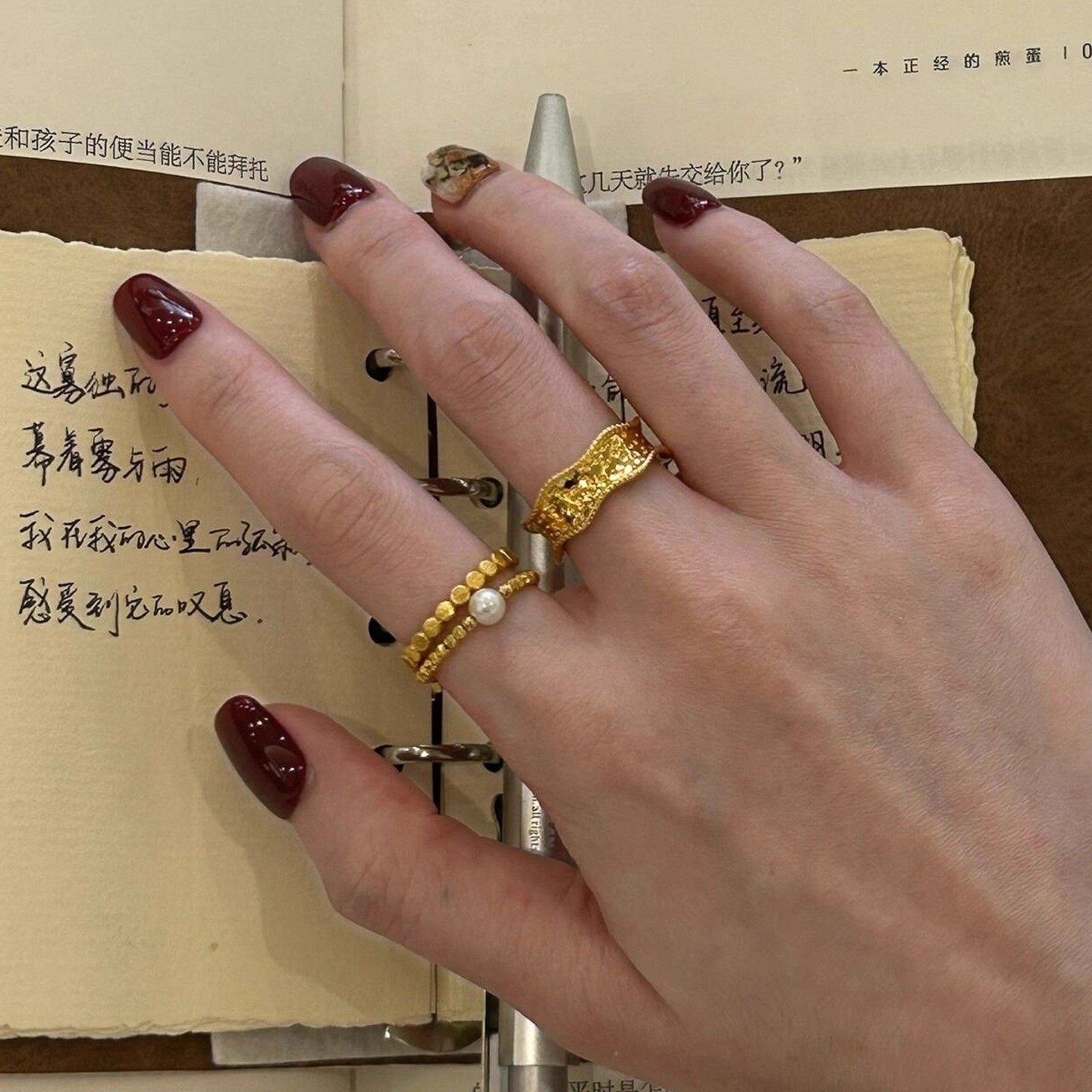 琥珀珍珠树脂食指戒指女小众设计轻奢高级感尾戒复古叠戴装 饰指环
