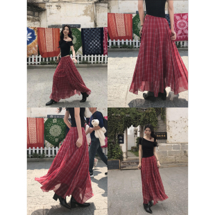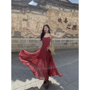 MULVAN 吊带连衣裙女气质收腰显瘦半身裙 巨好看度假风红格子长款