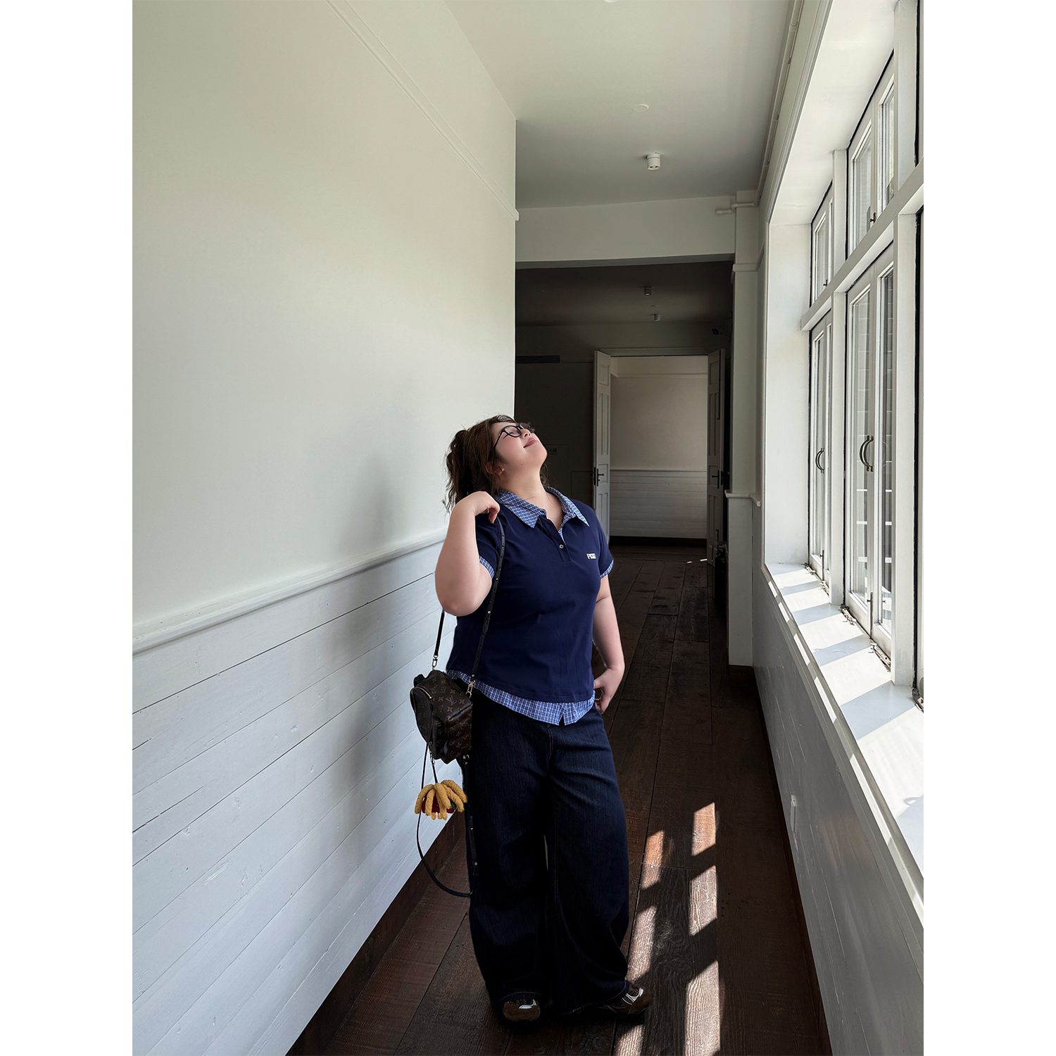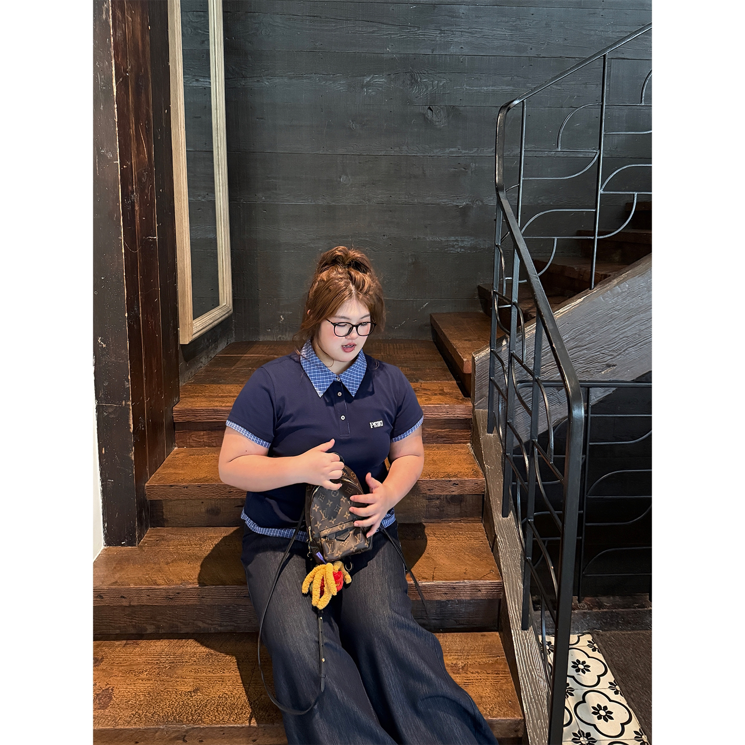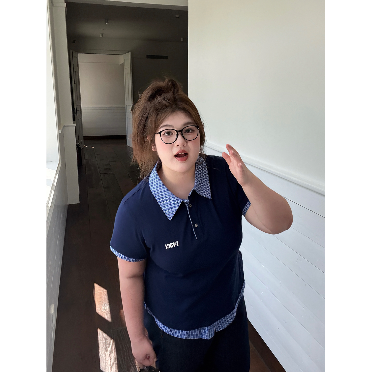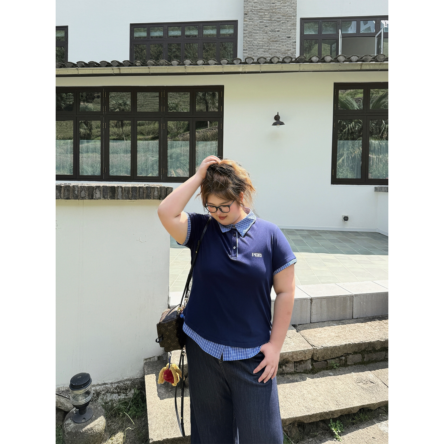 女 短袖 老章和小胖PONGKIKI假两件美式 复古T字母印花显瘦胖mm大码