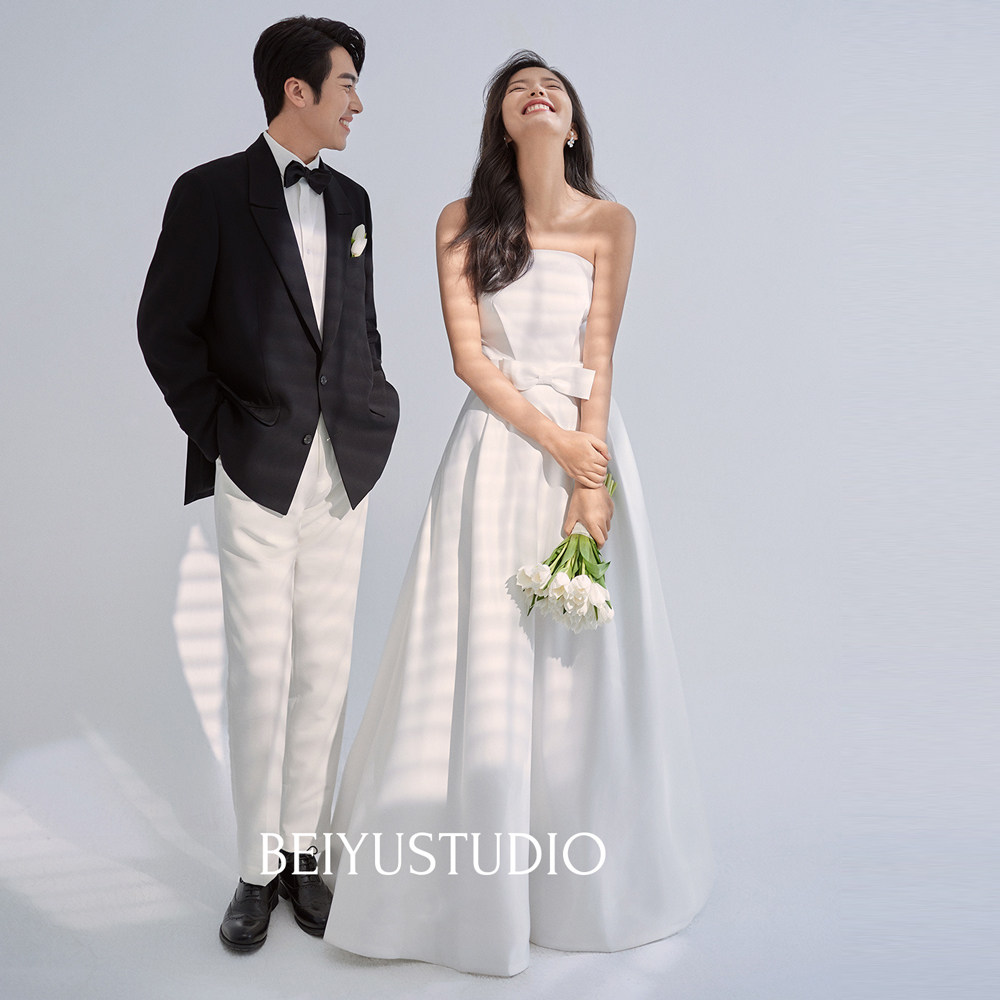 法式 高级感出门纱简约气质白色拖尾礼服 抹胸缎面婚纱新娘2025新款