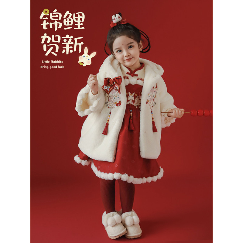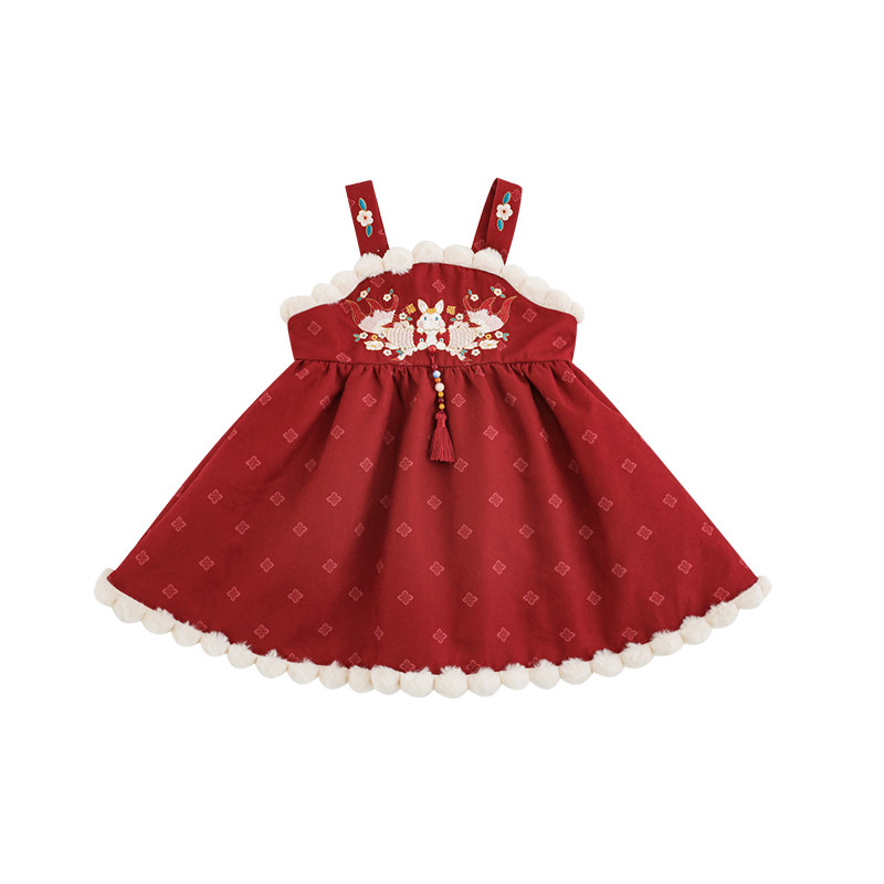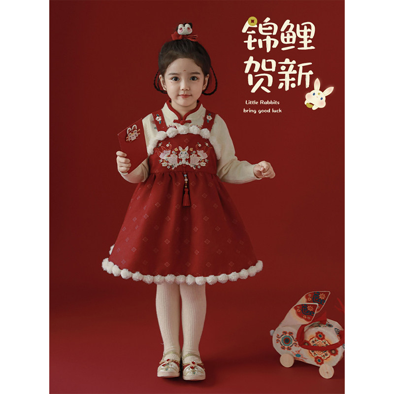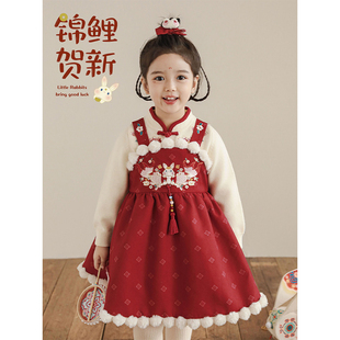 幼悠女童中式 加绒加厚古风设计万针刺绣连衣裙 年服背带裙2025冬季
