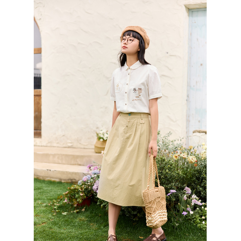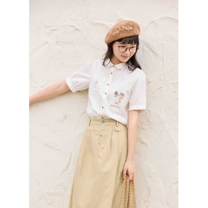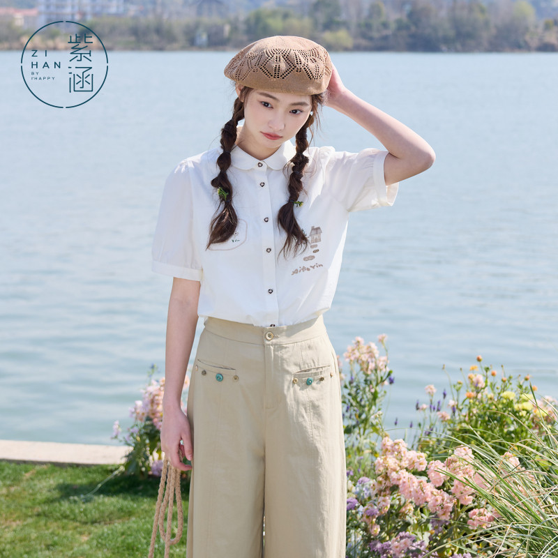 新款 女士夏季 田园风贴布刺绣可爱白色衬衣 衬衫 紫涵直筒娃娃领短袖