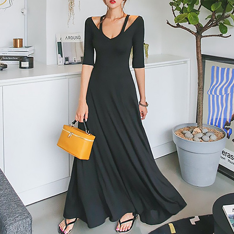 女 5分袖 韩版 新款 低胸镂空大摆超长拖地连衣裙 2020夏季 藤堂家大码