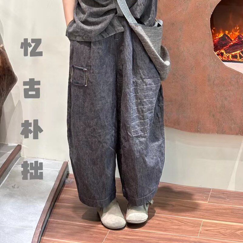 衣牧了然色织定仿亚麻休闲裤 质朴高档补丁文艺复古女士宽松麻裤