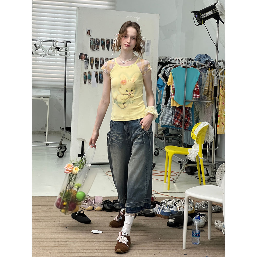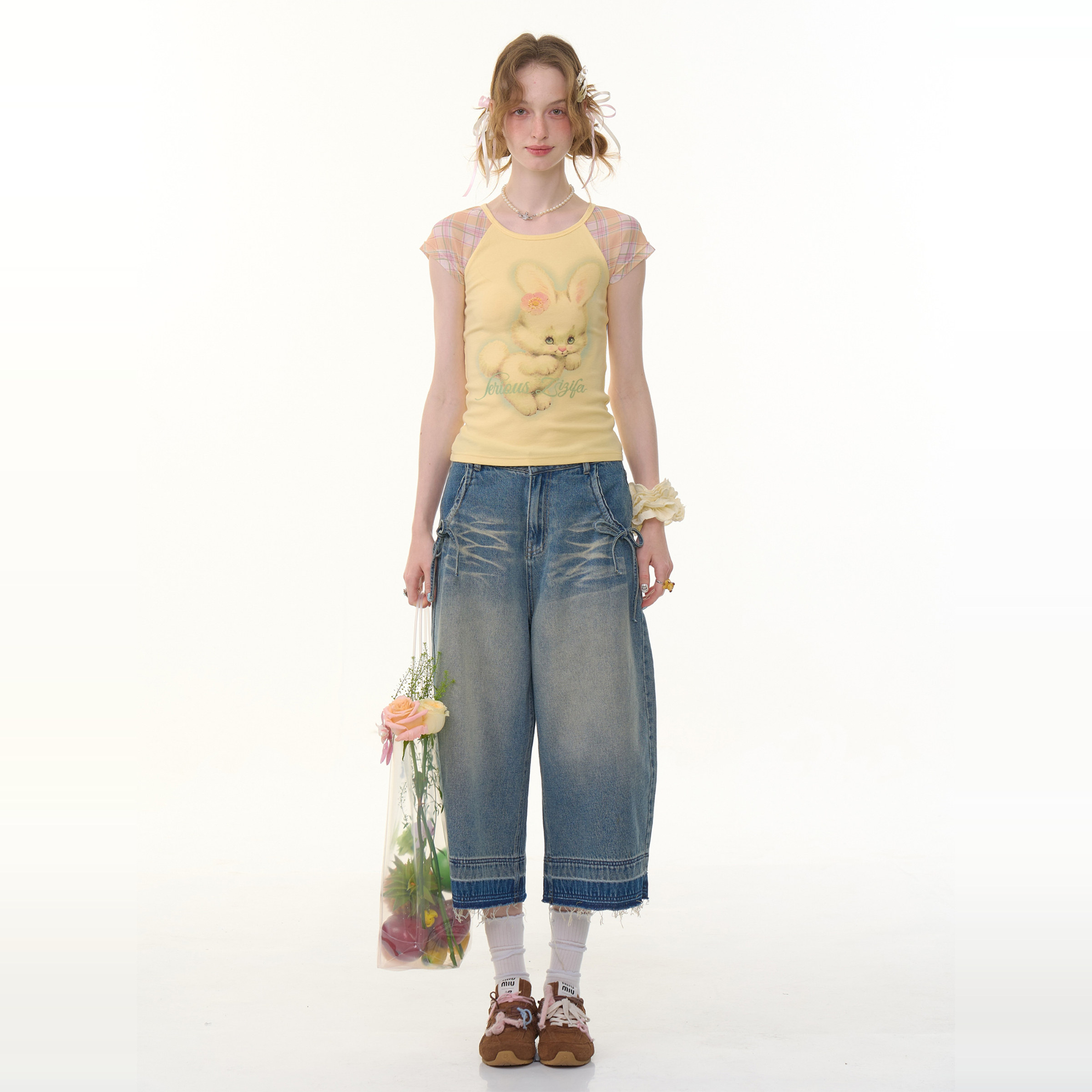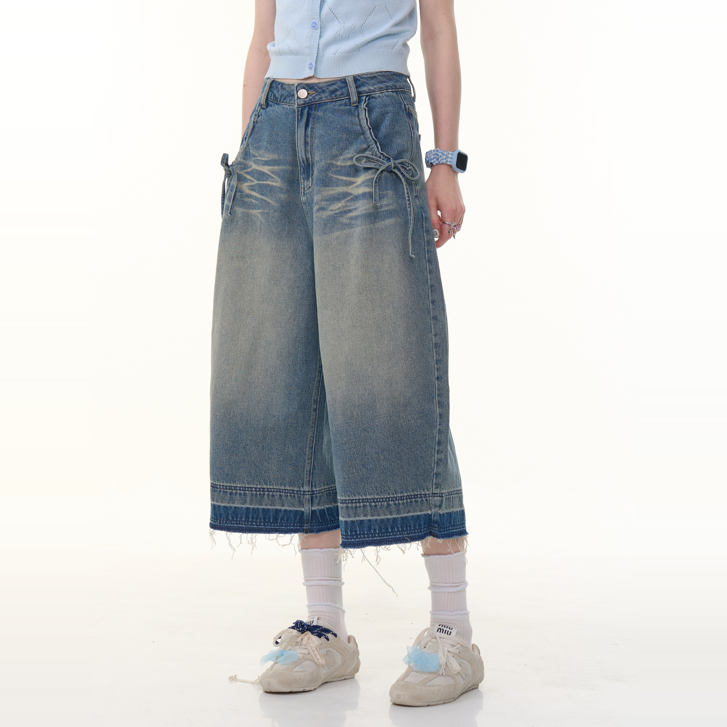 蓝水洗蓝高腰显瘦直筒阔腿七分牛仔裤 复古新款 女 美式 ziziFei夏季